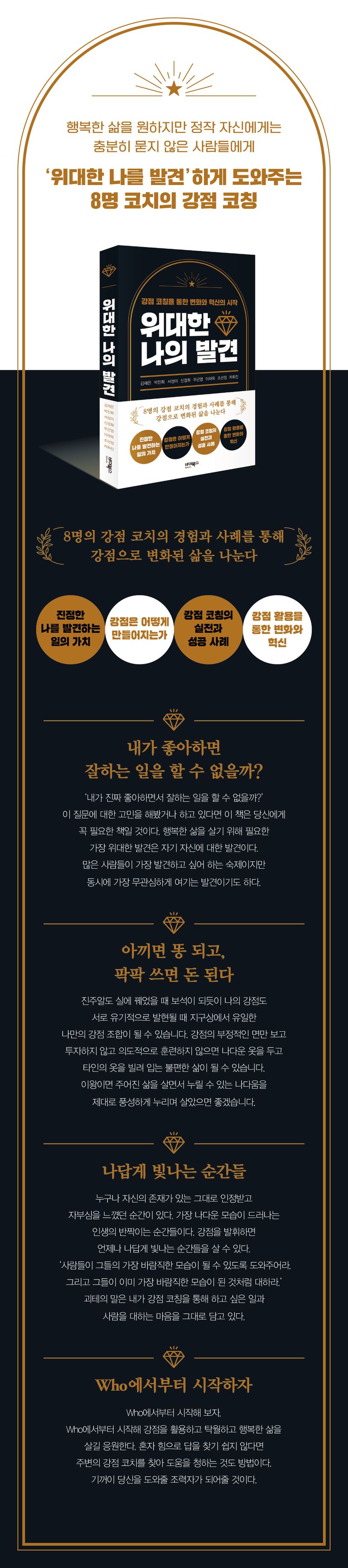‘위대한 나를 발견’하게 도와주는 8명 코치의 강점 코칭. 행복한 삶을 원하지만 정작 자신에게는 충분히 묻지 않은 사람들에게 김재은, 박진희, 서성미, 신경화, 우근영, 이재욱, 조선정, 차휘진 코치가 ‘위대한 나를 발견’하게 도와주는 강점 코칭을 담은 《위대한 나의 발견》을 썼다. 강점 코칭을 통한 변화와 혁신의 시작의 방법과 사례가 담겨 있다. 이 책은 슬럼프에 빠졌을 때 자신의 정체성을 다시 한번 살펴보고 자신이 가진 강점을 잘 활용하는 방법을 찾아 실천해 나가도록 돕는다. 혼자 힘으로 답을 찾기 쉽지 않다면 주변의 강점 코치를 찾아 도움을 청하는 것도 방법이다. 여기 8명의 코치가 기꺼이 당신을 도와줄 조력자가 되어줄 것이다.
