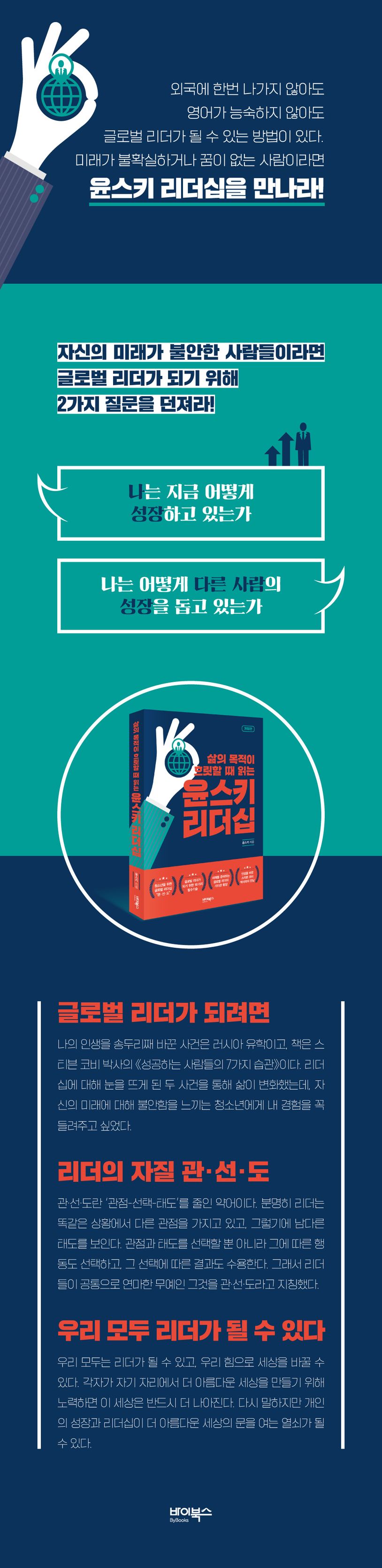 미래가 불확실하거나 꿈이 없는 사람을 위한 《삶의 목적이 흐릿할 때 읽는 윤스키 리더십》의 개정판. 윤스키 아카데미 대표로 사람의 성장을 돕고, 성품을 개발하고, 좋은 습관계발을 통해 가시적 성과를 이끌어내는 리더십 교육과 코칭을 하는 저자 윤스키의 《삶의 목적이 흐릿할 때 읽는 윤스키 리더십》를 새롭게 다시 만난다. 이 책에는 외국에 한번 나가지 않아도 영어가 능숙하지 않아도 글로벌 리더가 될 수 있는 방법이 담겨 있다. 입시로 고민하는 청소년, 취업에 사활을 건 청춘, 가정을 지키기 위해 고군분투하는 장년을 가릴 것 없이 성장과 리더십이 필요하고 모두 리더가 될 수 있다. 이 책과 함께 그 길로 나아가보자.