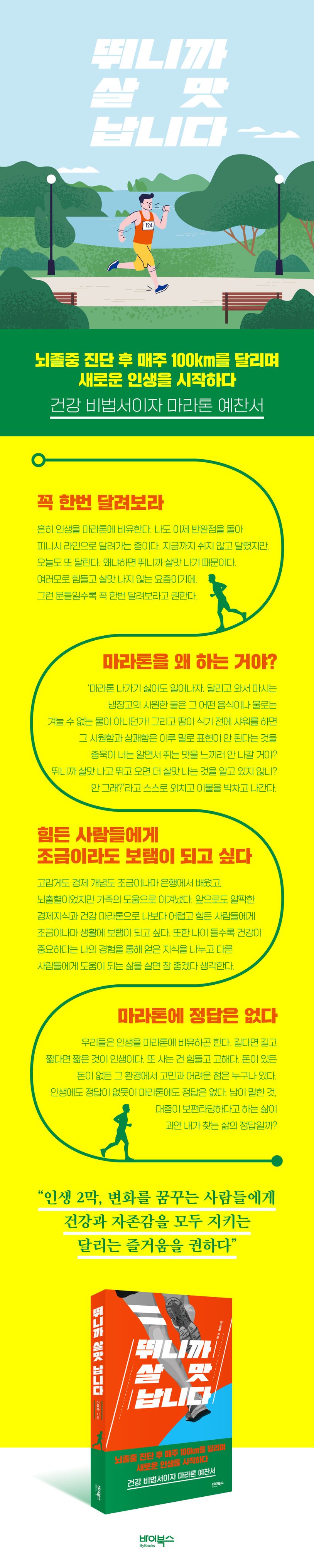 인생 2막, 변화를 꿈꾸는 사람들에게 권하는 건강 비법서이자 마라톤 예찬서. 현재 전국퇴직금융인협회 금융해설사로 금융소외계층 및 사회취약계층을 위한 금융컨설턴트 및 강사로 활동 중인 저자 이종욱이 《뛰니까 살맛 납니다》를 세상에 내놓는다. 일에 대한 욕심으로 무리하다 보니 뇌출혈로 쓰러지는 아찔한 상황까지 겪었지만, 운명처럼 찾아온 운동인 마라톤으로 건강을 되찾았다. 이 책에는 뇌졸중 진단 후 매주 100km를 달리며 새로운 인생을 시작한 경험을 담았다. 인생에도 정답이 없듯이 마라톤에도 정답은 없다. 이 책에 나오는 다양한 비법은 자신에 맞게 적용해 건강과 자존감을 모두 지키는 달리는 즐거움을 맛보기를 기원한다.