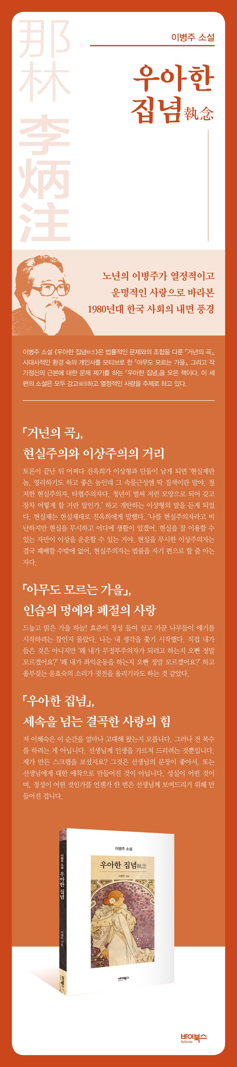 노년의 이병주가 열정적이고 운명적인 사랑으로 바라본 1980년대 한국 사회의 내면 풍경. 이병주 소설 《우아한 집념(執念)》은 법률적인 문제와의 조합을 다룬 「거년의 곡」, 시대사적인 환경 속의 개인사를 모티브로 한 「아무도 모르는 가을」, 그리고 작가정신의 근본에 대한 문제 제기를 하는 「우아한 집념」을 모은 책이다. 이 세 편의 소설은 모두 강고(强固)하고 열정적인 사랑을 주제로 하고 있다. 이병주도 60대가 되자 세상을 보다 유연하고 폭넓게 바라보는 시각을 얻게 되었다. 그러한 변화가 담긴 1980년대 초반 그의 소설들, 인본주의자의 눈으로 세상살이의 새로운 지혜와 남녀 간 사랑의 다양다기한 모습을 그려내는 작품들을 직접 만나보자.