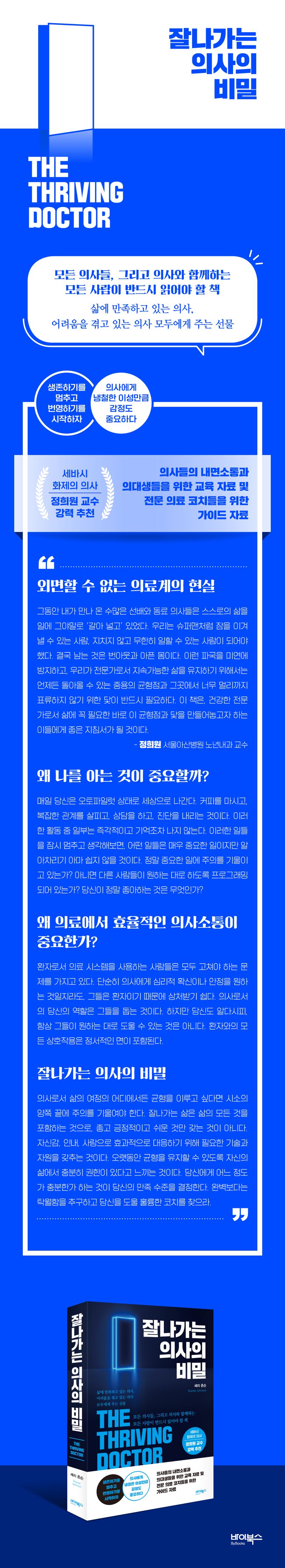 모든 의사들, 그리고 의사와 함께하는 모든 사람이 반드시 읽어야 할 책. 긴급외상센터나 응급실뿐만 아니라 많은 필수의료 분야에서 의료진의 이탈과 번아웃은 이제 해결을 더 이상 미룰 수 있는 문제가 아니다. 의료 체계의 위기는 국민건강에 직결되어 있기에 의사들의 겪는 심리적 위기를 누구도 외면할 수 없는 것이 냉혹한 현실이다. 코칭은 심리상담이나 멘토링 등과는 구분되는 영역으로 의료인에게 반드시 필요한 스킬인데, 최근 대형병원 및 의대생 교육에도 활용되기 시작하였고 코칭계에서도 의료분야 진출을 적극 모색 중이다. 《잘나가는 의사의 비밀》는 의사들의 내면소통과 의대생들을 위한 교육 자료 및 전문 의료 코치들을 위한 가이드 자료로써, 이 책에 나오는 이러한 방법을 따라 한다면 의사뿐만 아니라 누구도 성장할 수 있고 주변 사람들에게도 도움이 될 수 있을 것이다.