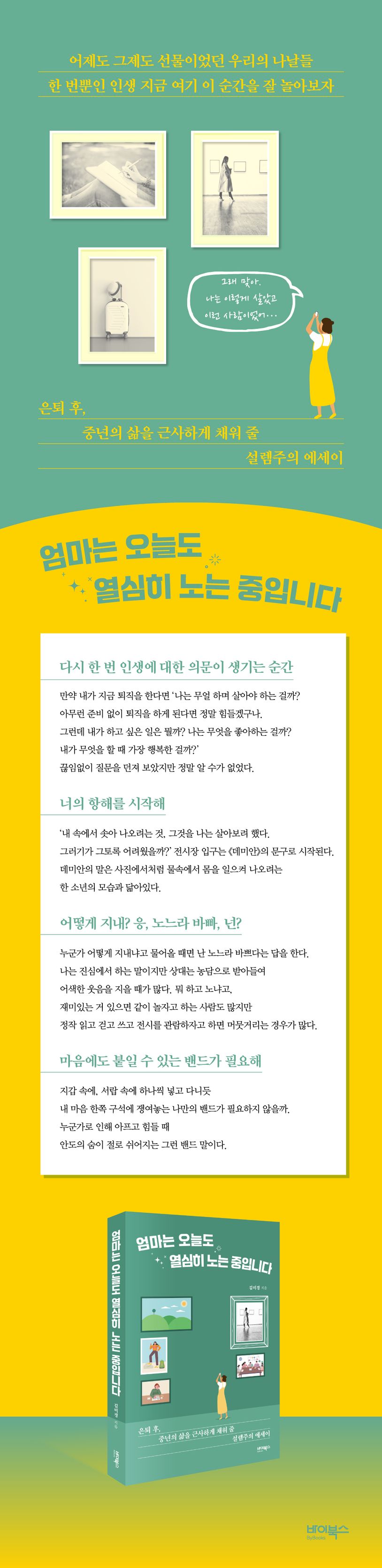 은퇴 후, 중년의 삶을 근사하게 채워 줄 설렘주의 에세이. 영화, 전시, 공연, 전시관람 등 좋아하는 일들을 하나씩 찾으며 노는 즐거움을 발견한 저자 김미경이 《엄마는 오늘도 열심히 노는 중입니다》를 세상에 내놓는다. ‘내가 무엇을 할 때 가장 행복한 걸까?’라는 인생에 대한 의문이 생기는 시기를 지나고 있는 어른들에게, 삶은 어제도 오늘도 선물이었으며 앞으로가 아닌 ‘지금, 이 순간’이 가장 소중함을 깨닫기를 바라는 마음으로 썼다. 이 책은 문득 ‘내 인생에 ‘내’가 없구나. 내가 좋아하는 일이 뭘까?’ 궁금한 중년을 위한 책이다. 때로는 다친 마음에 붙일 수 있는 밴드가, 때로는 새로운 시작을 응원하는 자양강장제가 되기에 충분하다. 우아하게 멋나게 노는 여러분의 인생을 응원한다.