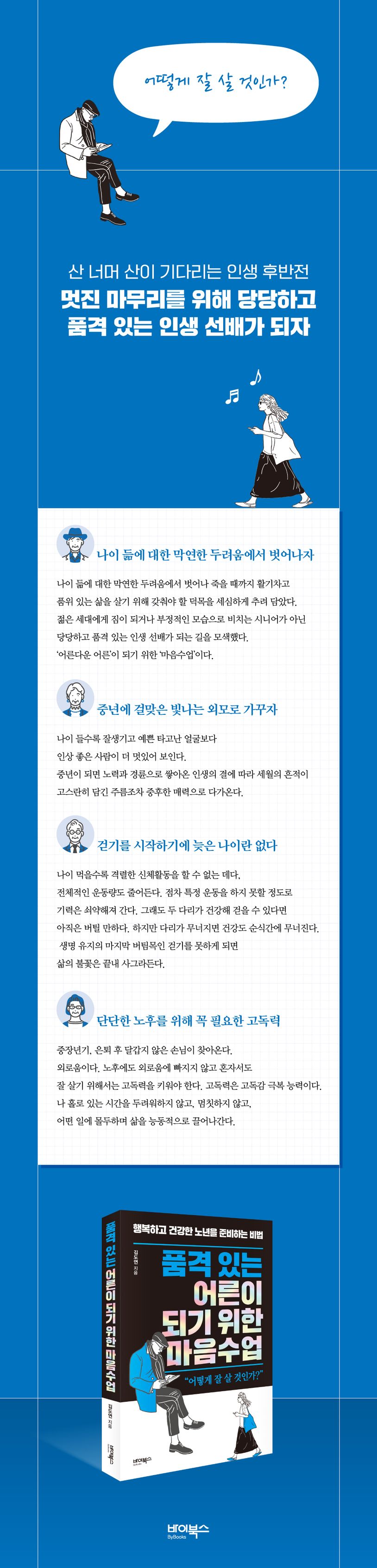 행복하고 건강한 노년을 준비하는 비법. 현재 문화일보 기자로 일하고 있는 저자 김도연이 4060 중장년들을 위한 마음수업 지침서인 《품격 있는 어른이 되기 위한 마음수업》을 세상에 내놓는다. 나이 듦·노년·인생 2막에 대해 큰 관심을 두고 관련 서적 1,000여 권을 탐독하고, 34년 차 기자로서 그동안 수많은 사람을 만나고 겪은 에피소드를 바탕으로 ‘어른다운 어른의 품격을 갖춘 시니어’, ‘인간다운 매력을 갖춘 시니어’가 되는 길을 탐색한 결과다. 이 책은 아름다운 마무리를 염두에 둔 인생 후반전을 응원한다. 시작도 중요하지만, 마무리도 중요하다. 오늘 하루, 지금 이 시간에 집중하자. 끝이 창대할 수 있도록!
