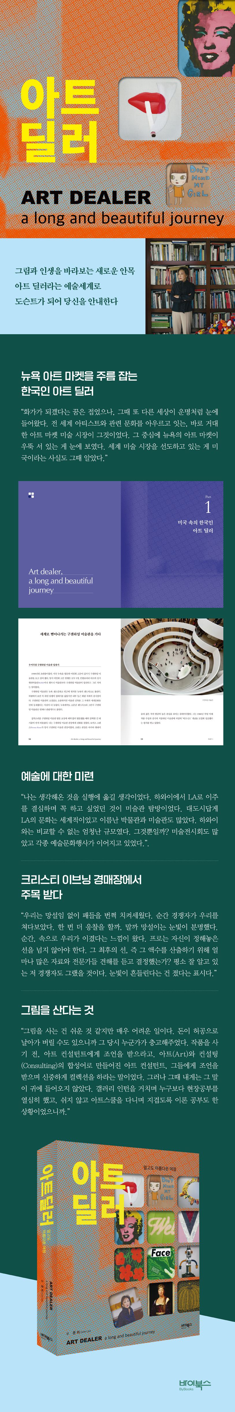 그림과 인생을 바라보는 새로운 안목, 아트 딜러라는 예술세계. 자타공인 아트 딜러로 확고히 자리 잡은 저자 준 리(June Lee)가 고국을 떠난 지 반세기가 넘은 지금, 미국에서 아트 딜러로 성장하고 자리매김할 때까지 겪었던 좌절과 시행착오를 기록으로 남기고 싶어 《아트 딜러, 멀고도 아름다운 여정》을 썼다. 한 사람의 자전적인 기록인 동시에 아트 딜러라는 예술세계를 안내하는 도슨트의 역할을 한다. 나날이 커지는 한국 예술 시장을 보며, 저자의 경험이 후학들의 성장과 성공에 도움이 되기를 바란다. 이 책은 미국에서 성공한 한국인 아트 딜러의 이야기일 뿐만 아니라 예술품과 아트 마켓에 관심이 있는 모든 사람에게 유용한 안내서가 될 것이다. 그림을 산다는 매력에 한번 빠져보자.