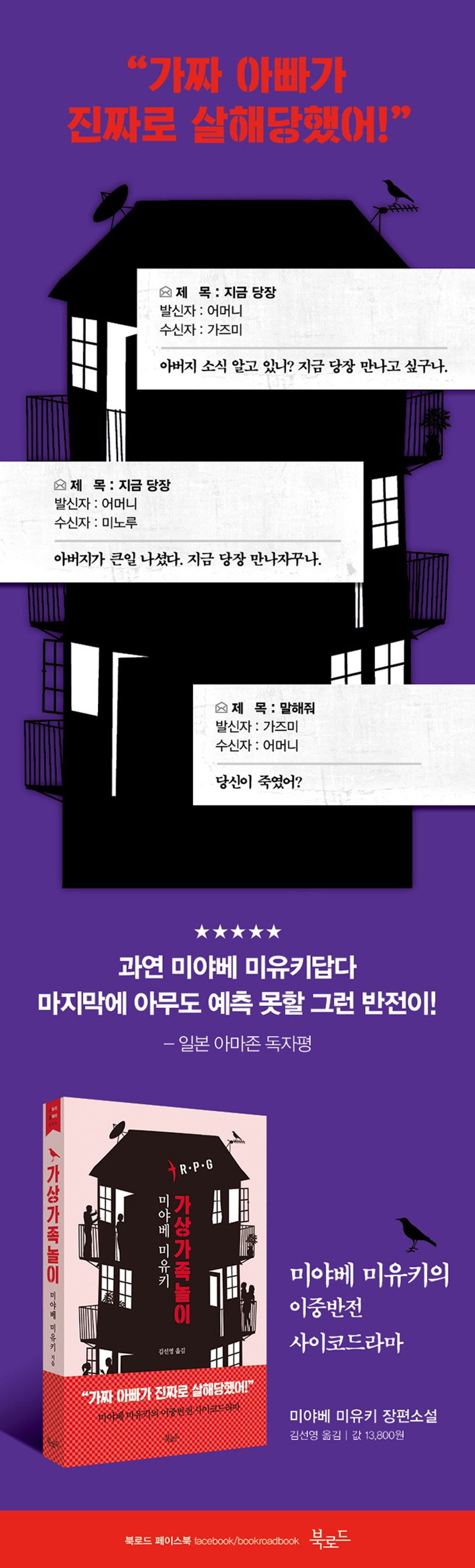 미야베 미유키의 특기라 할 수 있는 사회파 미스터리의 전형적인 모습을 여실히 보여주는 수작 『가상가족놀이』. 인터넷상의 가상가족을 만들었던 피해자와 그 주변 인물들의 관계를 집요하게 파헤침으로써 가족이라는 최소한의 틀마저 무너진 현대 사회의 모습을 적나라하게 보여주는 작품이다. 도코로다 료스케라는 이름의 한 남자가 공사 현장에서 잔인한 변사체로 발견된다. 경찰은 수사 끝에 사흘 전에 일어난 21세 여대생 이마이 나오코 살인사건과 연관성을 찾아내고, 언뜻 평범한 직장인이자 가장인 것처럼 보였던 도코로다 료스케가 인터넷상에서 ‘아버지’라는 닉네임으로 몇몇 사람들과 함께 ‘가상가족놀이’를 했다는 사실을 밝혀낸다.