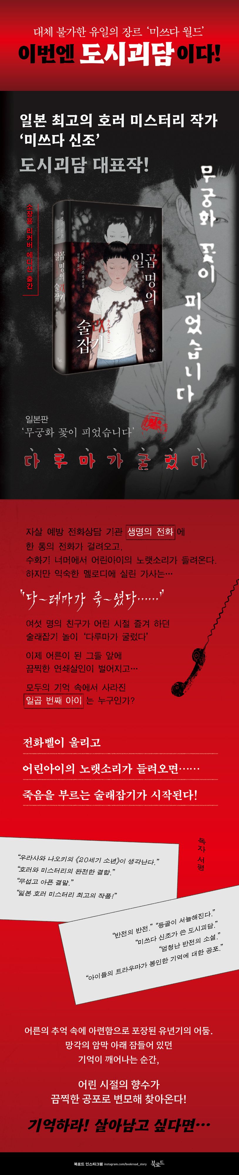 호러와 미스터리의 장르적 결합 외에도 사실과 허구를 넘나드는 메타픽션의 작법 등 독특한 작풍으로 독자들에게 기존의 호러나 추리가 아닌 ‘대체 불가한 별개의 한 장르’라는 극찬을 받는 ‘미쓰다 월드’. 《일곱 명의 술래잡기》는 작가가 이제까지 그려온 민속학적 배경이 아니라 현대 도시를 무대로 함으로써 ‘미쓰다 월드’ 안에서도 독특한 위치를 점한 작품이다. 《일곱 명의 술래잡기》는 미쓰다 신조의 명성은 익히 들었으나 다소 마니악하게 느껴지는 특징으로 인해 입문이 쉽지 않았던 초심자들과 기존 팬들을 모두 만족시킬 수 있는 훌륭한 ‘괴담 특식’이 될 것이다.