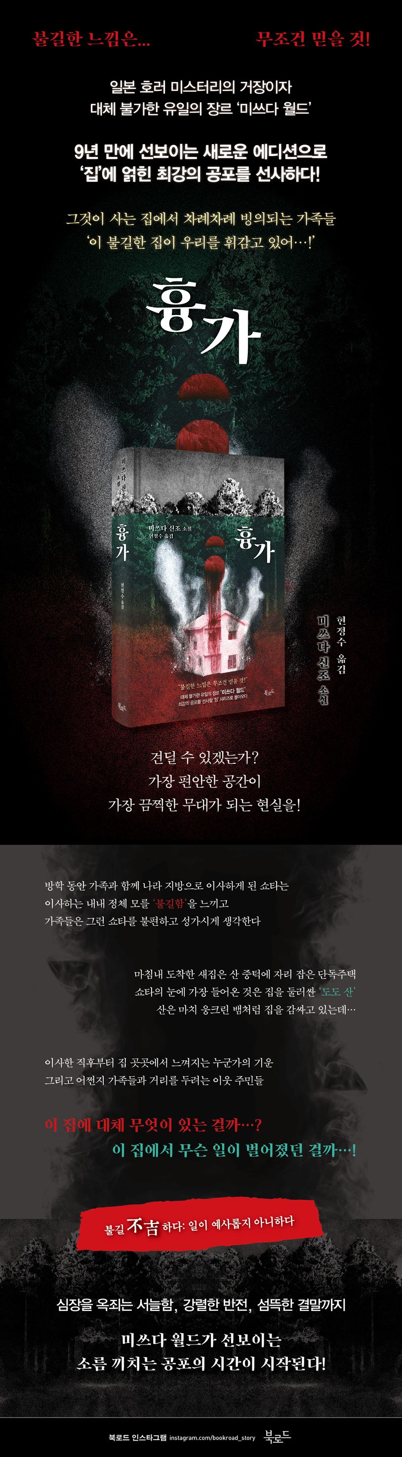 북로드에서 새롭게 선보이는 《흉가》는 2016년 출간된 《흉가》의 개정판이자, ‘집 시리즈 3부작’ 중에서도 가장 대표적인 작품이라 할 수 있다. 사회적 불안과 혼란이 가중되고 이웃끼리 주고받던 정과 신뢰가 점점 사라지는 시대, 집과 동네가 가장 다정하고 따뜻한 공간이었던 과거와 달리 이제는 내 집에서도 안심할 수 없고 이웃조차 경계하게 된다는 우려가 가득한 오늘날의 풍조에 맞추어 기존의 독자뿐 아니라 새로운 독자들에게도 ‘미쓰다 월드’가 선보이는 공포의 시간을 전한다. 감각적이면서도 오싹한 긴장감을 전하는 일러스트와 장정은 개정판에서만 만날 수 있는 또 다른 매력이다.