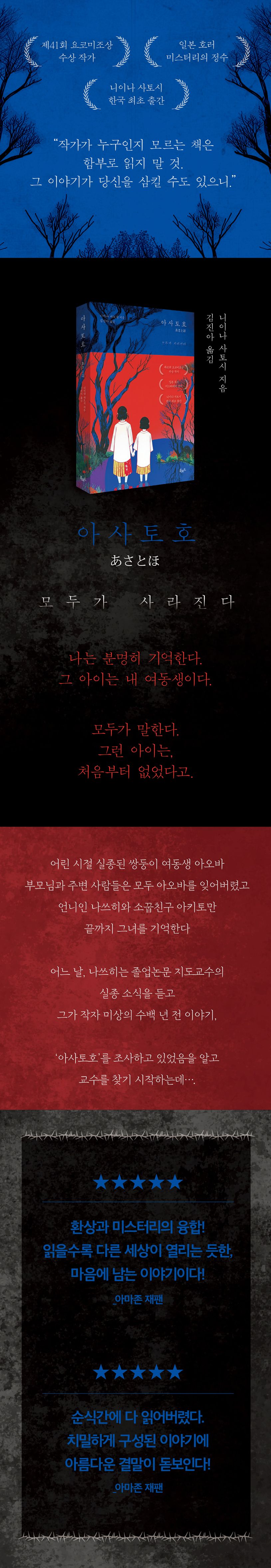 이번에 북로드에서 출간한 《아사토호: 모두가 사라진다》는 한국에 처음 소개되는 니이나 사토시의 장편소설이다. 니이나 사토시는 41회 요코미조 세이시 미스터리&호러상을 수상하며 큰 주목을 받은 신예 작가이다. 그는 괴담과 현실과 환상을 아슬아슬하게 오가며 착실하게 이야기를 쌓아가는 솜씨가 탁월하다는 호평을 받고 있으며, 미스터리 호러 장르에 머물지 않고 보다 다양한 주제와 소재로 활발한 작품 활동을 이어간다는 점에서 미래가 더욱 기대되는 작가로 손꼽히기도 한다. 《아사토호》의 한국판 출간이 더욱 반가운 이유이다.