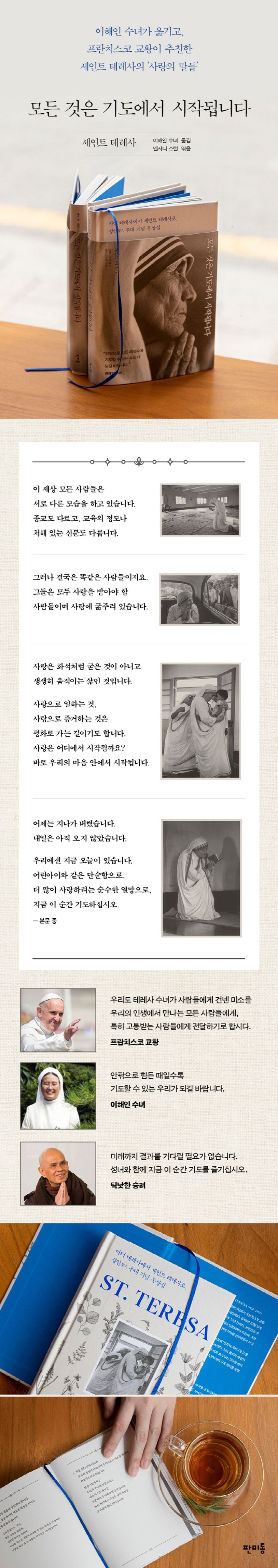 세인트테레사(1910-1997)글 2016년9월4일바티칸성베드로대성당에서프란치스코교황주례로성인(聖人,SAINT)으로시성되었다.2003년10월성자바로전단계인복자로서품된이후13년만이다.성인으로추대되기위해서는2개이상의기적이인정되어야하는데,프란치스코교황이테레사수녀의두번째기적을인정하면서시성으로확정되었다. 평생을가난하고소외된이들을보살펴‘빈자의어머니’로도불렸으며,1979년노벨평화상을수상했다.인도콜카타슬럼가에세운‘사랑의선교회’는현재전세계호스피스·고아원·에이즈환자시설·중독치료센터등총4,500개의구호센터를운영하고있다. 이해인옮김 수도자로서의삶과시인으로서의사색을조화시키며기도와시를통해복음을전하는수녀시인.1945년강원도양구에서태어나필리핀성루이스대학영문학과와서강대대학원종교학과를졸업했다.현재부산성베네딕도회수녀로봉직중이며,『민들레의영토』,『다른옷은입을수가없네』,『이해인시전집1·2』등다수의책을펴냈다. 앤서니스턴엮음 의학박사.하버드대학교와마운트시나이의과대학을졸업했다.지역사회정신과의사로서다양한환경에서일했고,현재웨스턴유나이티드의생활공동체인할렘노숙자보호소에서일하고있다.지난30년동안세라로런스칼리지,미국자연사박물관,세계정신의학협회등다양한곳에서종교와심리학에관한글을쓰고발표했다.