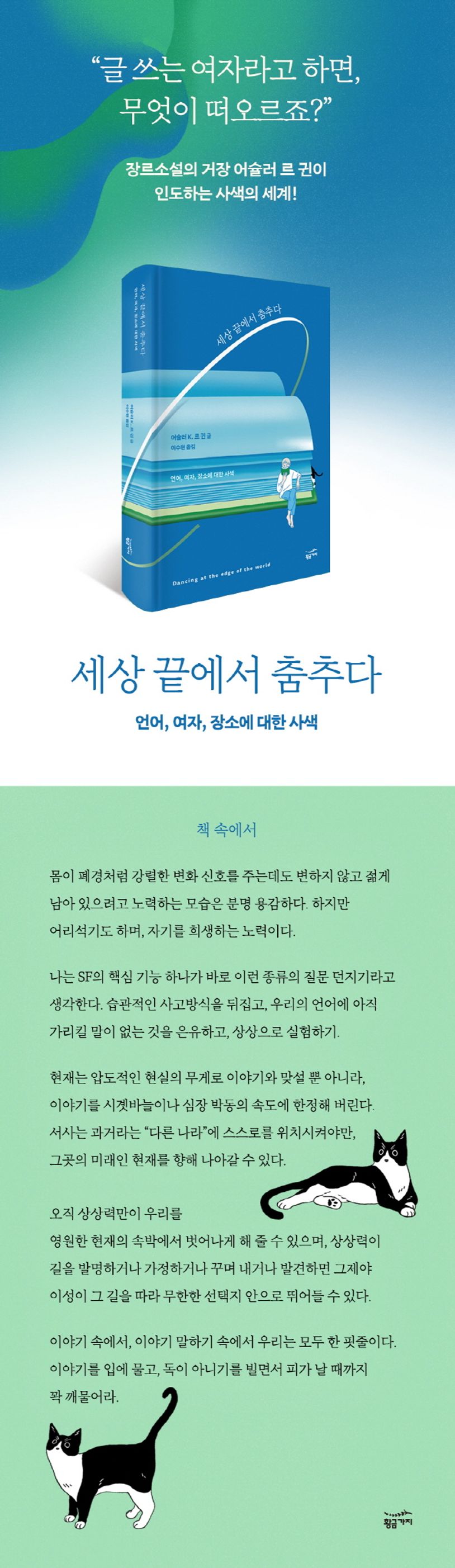 휴고 상, 네뷸러 상, 로커스 상 등 최고 권위의 장르문학상을 여러 차례 석권하고, 미국 문단에 끼친 공로로 전미 도서상 메달을 수여받기도 했던 어슐러 르 귄의 『세상 끝에서 춤추다』. 르 귄이 예순의 나이를 목전에 두었던 1989년에 출간된 이 책에는 70년대 후반부터 80년대 전반에 걸쳐 발표했던 강연용 원고, 에세이, 서평이 수록되어 있으며 이듬해 휴고 상 논픽션 부문 최종 후보에 오르기도 했다. 서평을 제외한 각각의 글은 주제에 따라 여성, 세계, 문학, 여행을 나타내는 네 가지 기호가 붙어 있는데, 서문에서는 그 의도를 “특정 경향에 동조하지 않는 독자들이 피해 가는 데 쓸모가 있었으면 좋겠다. 물론 무엇이든 주는 대로 받으려는 독자라면 아무래도 상관없을 것”이라고 위트 있게 밝히고 있다.