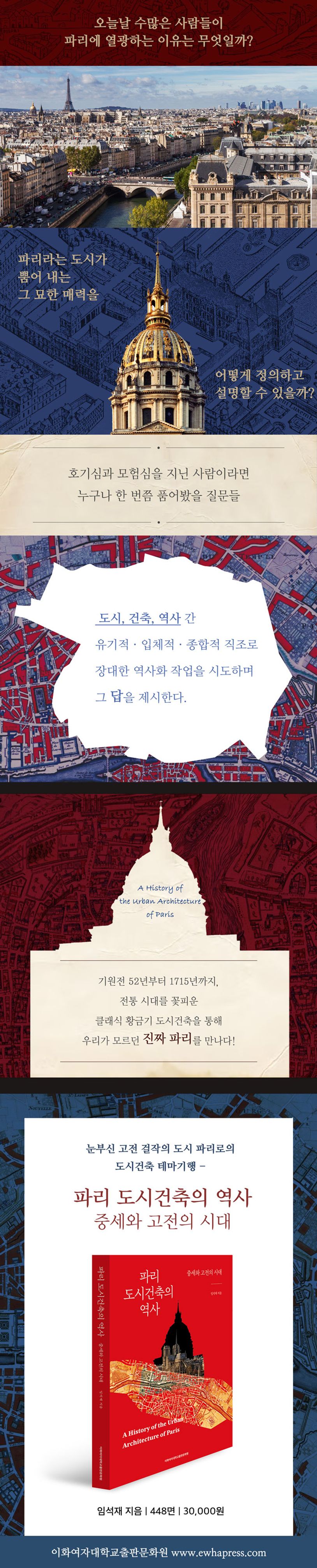 이 책은 파리가 탄생기-형성기-성장기를 거쳐온 모습을 살피며 각 시대의 상황 및 시대별 도시건축의 내용을 26개 장과 128개 소주제로 세분해 소개하는, 그야말로 장대한 역사화 작업의 결과물이라 할 수 있다. 독자들은 이 책에서 다루는 풍부하고 다채로운 역사 자료를 통해 ‘유럽 고전 걸작의 도시’ 파리가 지나온 클래식 황금기로의 흥미진진한 시간여행을 만끽할 수 있을 것이다.