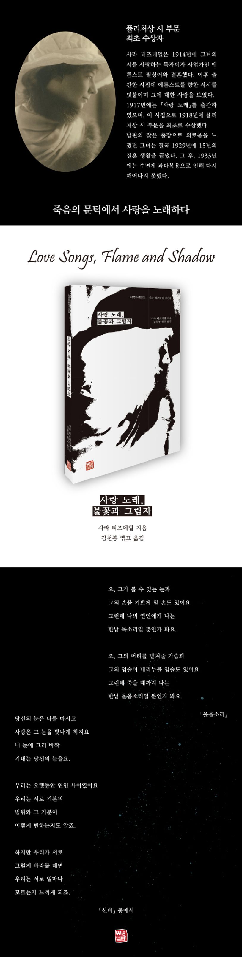 이 책은 영문학계의 주요 시인들을 선별하고, 시를 선별하여 모아 낸 ‘소명영미시인선’ 시리즈이다. 『사랑 노래, 불꽃과 그림자』는 그 두 번째 책으로, 감미로운 서정시로 알려진 사라 티즈데일의 시선집이다.