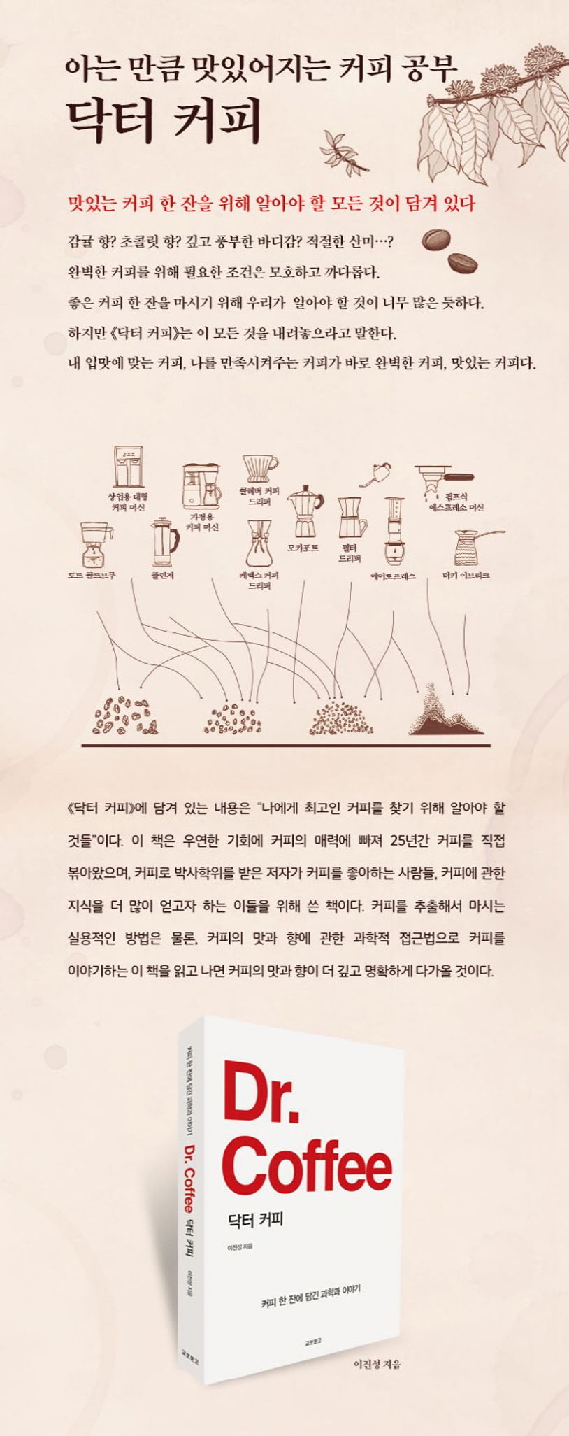 우리에게 커피는 이제 일상의 음료다. 아침을 커피 한 잔과 함께 시작하는 것은 당연한 풍경이 되었다. 커피 시장이 커지는 것과 함께 사람들의 커피에 관한 지식도 함께 늘었다. 원두의 종류, 커피의 산지, 로스팅 방법, 분쇄와 추출법은 이제 커피를 즐기는 사람들 사이에서는 어느 정도 상식이 되었다. 아쉽게도 커피에 관한 지식을 담은 책은 이런 상식의 한계를 넘지 못했다. 커피를 좀 더 알고자 하는 사람들에게는 해외의 책이나 논문밖에 대안이 없는 상황에서 《닥터 커피》가 이런 커피 지식의 목마름을 채워줄 것으로 기대된다.
