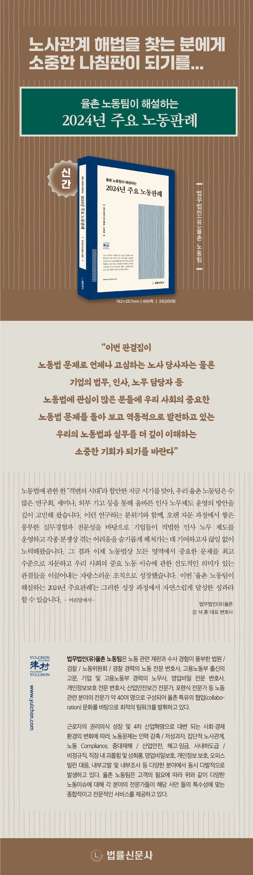 법무법인(유한) 율촌 노동팀이 지난해(2024년) 법원의 주요 노동 판결을 분석하고 해설한 판례집 《율촌 노동팀이 해설하는 2024년 주요 노동판례》(법률신문사 펴냄)를 출간했다.