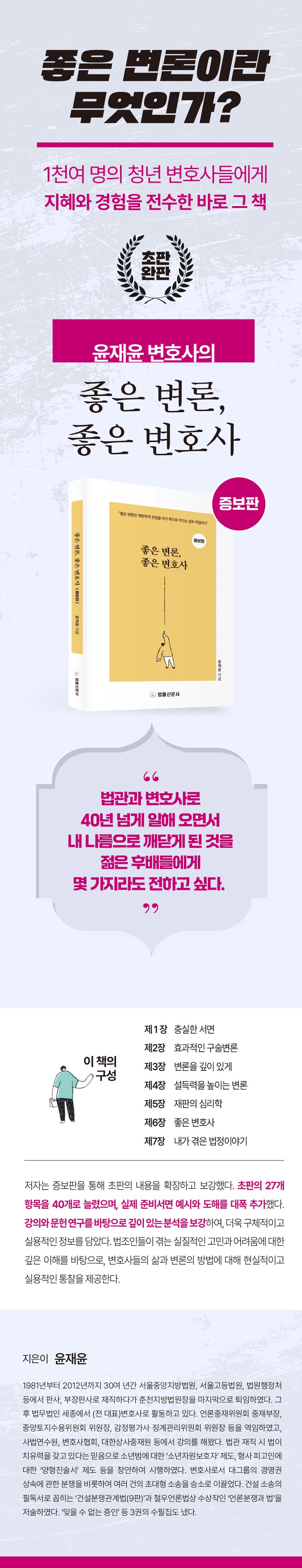 초판 출간 이후 청년 변호사들을 대상으로 강의를 진행하면서, 저자는 관련 문헌을 새로 찾고 과거에 모아두었던 판결들을 다시 검토했다. 그 과정에서 변론의 방법이나 변호사의 삶에 대한 우리 법조계의 관심이 매우 적고, 관련 연구나 판결도 부족하다는 사실을 다시금 깨달았다. 이러한 탐색의 결과로 이번 증보판에서는 실제 판결과 준비서면 예시, 도해 등을 추가해 초판의 27개 항목을 40개로 확대했다. 예기치 않게 많은 법률가들이 이 책과 강의에서 도움을 받았다고 전해와 큰 보람을 느꼈으며, 이 증보판이 좋은 변론과 삶을 추구하는 이들에게 조금이나마 도움이 되길 바라는 마음을 담아 펴냈다.