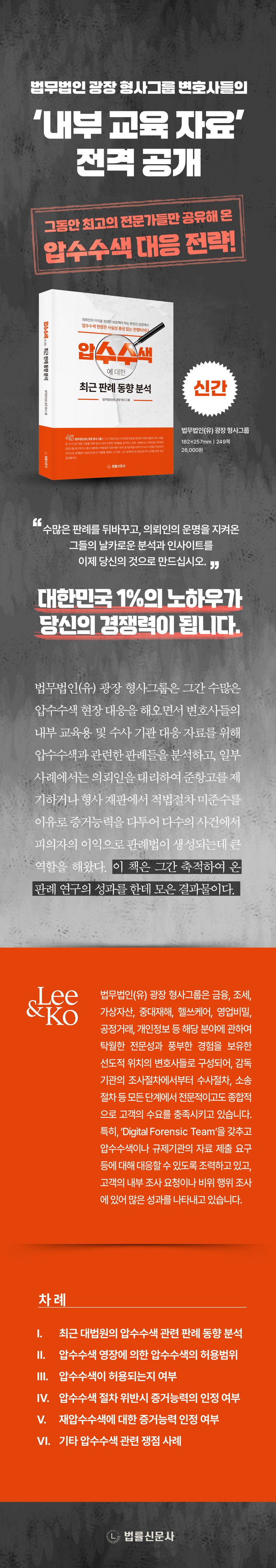 본서는 압수수색 현장을 ‘총성 없는 전쟁터’로 여기고 대응하는 변호사들은 물론, 수사 실무에 관여하는 모든 이들에게 가장 정확하고 시의적절한 지침을 제공할 것이다.