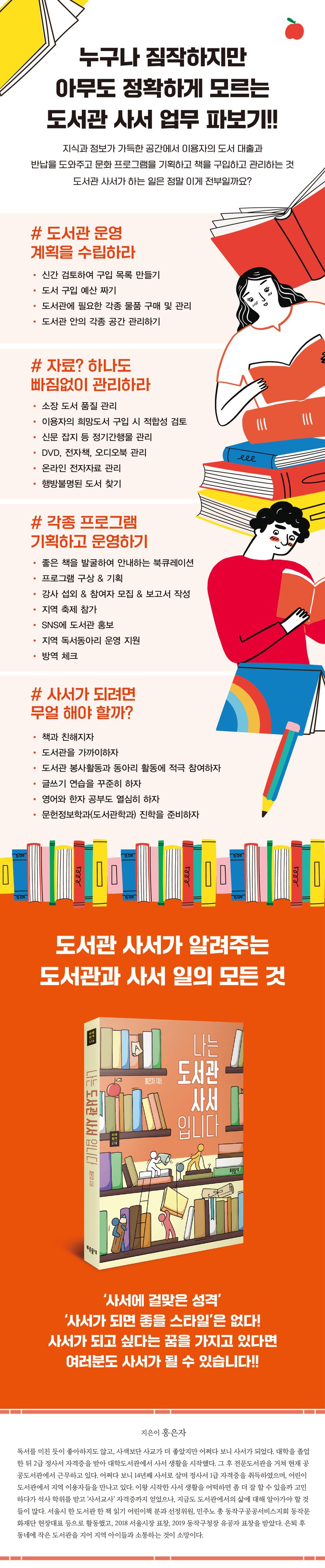 도서관에 가면 일단 기분이 참 좋다. 잡음 없는 조용한 공간, 게다가 그 공간을 가득 메운 책들, 간간이 들리는 책장 넘어가는 소리. 한참 그 공간을 응시하노라면 이용객들 머리 위로 글자가 떠다니는 것만 같다. 그러나 이 공간에서 제일 부러운 사람은 단연 사서다. 왠지 편안해 보이고, 별로 바쁜 일도 없어 보이고, 도서관의 주인 같고, 엄청 권력자처럼 보인다. 게다가 무엇이든 물어보면 척척 대답해줄 것 같다. 저 많은 책을 읽었을 테니, 모르는 게 없겠지…… 하면서. 이쯤 되면 도서관 사서는 정말 부러운 직업이야, 라고 질투의 시선을 보내지 않을 수 없다. 그런데 정말 그럴까? 도서관 사서들은 정말 우리가 생각하는 것처럼 ‘편하게’ ‘우아하게’ ‘읽고 싶은 책 실컷 읽으면서’ 일하는 사람들일까? 이 책의 지은이는 “사서는 당신 생각처럼 그렇게 한가하지 않아요!”라고 말한다. 그는 여전히 ‘사서는 편한 직업’이라는 편견과 마주할 때마다 “도서관에서 어떤 일을 하고 어떻게 하루를 보내는지 하나부터 열까지 알려주고 싶은” 마음이 든다고 한다.