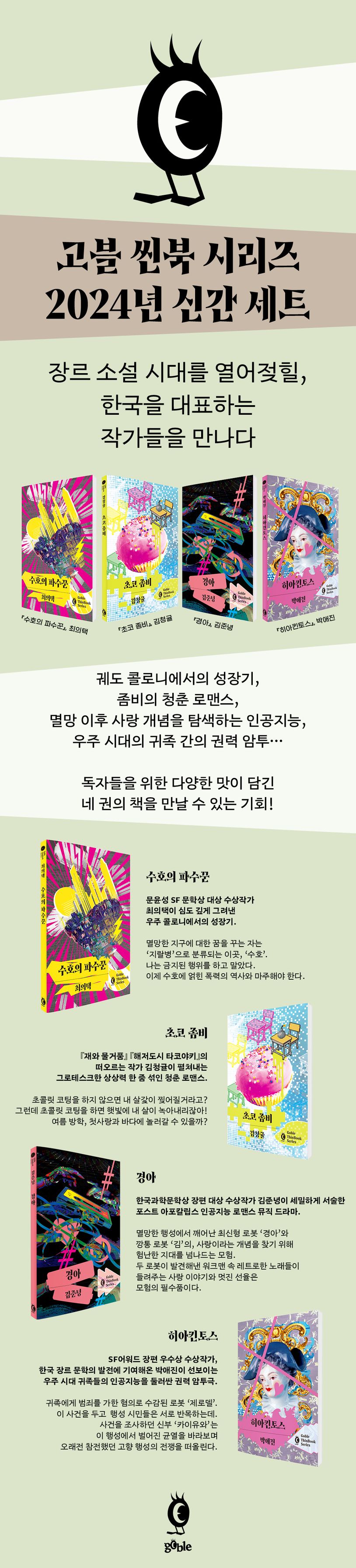 박애진의 『히아킨토스』는 그동안 ‘작지만 강고한 이야기’를 표방해온 고블 씬북에서 소개해온 책 중 가장 두툼한 두께를 가진 경장편 소설이다. 이 소설은 전설적인 만화 『베르사유의 장미』를 우주 개척 시대의 이야기로 다시 그려낸 듯한 배경 속에서, 인공지능과 인간성에 대한 사유를 깊이 녹여냈다.