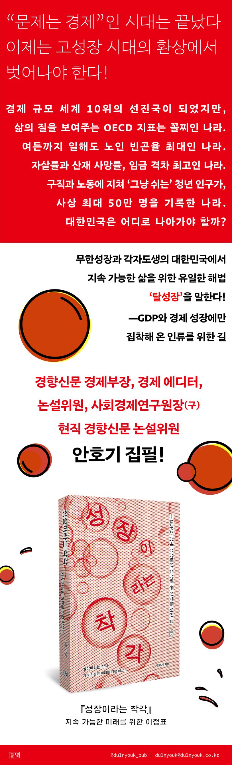 저자 안호기는 언론인으로서 30년 넘게 한국 사회를 적극적으로 취재한 경험을 바탕으로, 이제는 성장률이 아닌 ‘사람의 삶’을 중심으로 한 패러다임이 필요하다고 강조한다. 성장의 끝에서 우리가 마주한 것은, 번영이 아니라 파편화된 삶이다. 이 책은 불평등, 기후 위기, 돌봄의 붕괴, 금융 과잉 등 성장주의가 낳은 현실을 사례 중심으로 고발한다. 성장이 인류를 구원할 거라는 믿음을 거두고, 이제는 삶의 질과 분배, 공동체의 회복이 진짜 해법임을 강조한다. GDP 상승이 곧 행복으로 이어지지 않는다는 사실을 통계와 현실을 통해 정밀하게 짚는다.