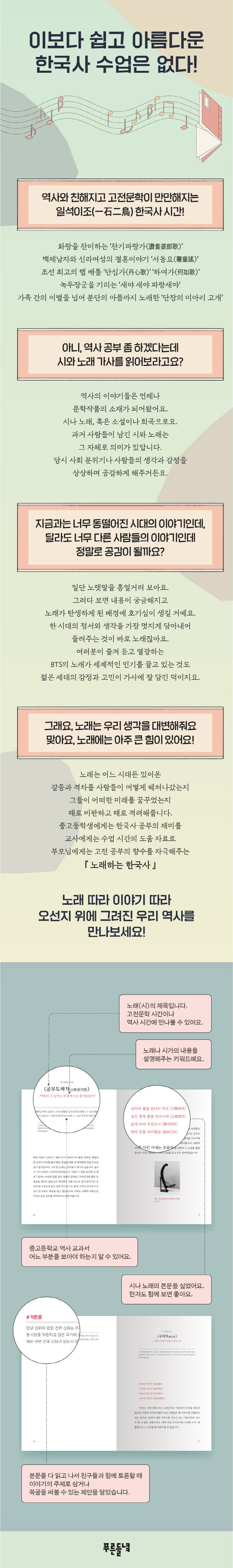 이 책에는 ‘한국사가 외워야 할 것만 많고, 지루하고, 따분한 과목이 되지 않았으면’ 하는 저자의 간절한 마음이 담겨 있다. 『노래하는 한국사』를 통해 독자들은 노래를 통해 그 시대를 이해하고, 노래를 만든 사람의 생각과 감정을 이해하면서 과거의 사람들도 우리와 다르지 않았음을, 우리 역사 속 굽이굽이마다 사람들의 숨결이 녹아 있음을 느낄 수 있을 것이다. 모쪼록 이 책이 한국사를 공부하는 많은 학생과, 의미 있고 재미있는 수업을 준비하느라 이 시간에도 고민하고 있을 교사들에게 도움이 되길 바란다.