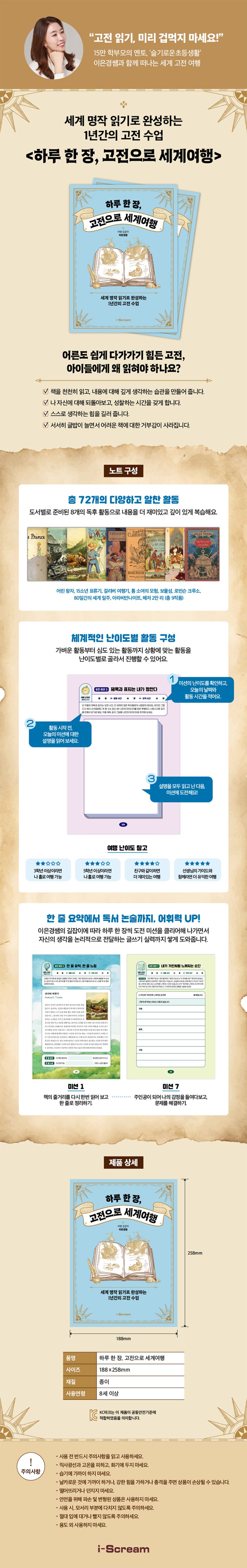 초등 교육 대표 콘텐츠 ‘슬기로운초등생활’의 이은경쌤이 아이들의 즐거운 고전 읽기를 돕는 『하루 한 장, 고전으로 세계여행』으로 찾아왔다. 어른도 쉽게 다가가기 힘들어하는 고전을 왜 아이들에게 읽혀야 할까? 이은경쌤은 고전 읽기를 통해 오래전부터 전해 오는 삶의 지혜와 문제 해결의 실마리를 발견하면서, 아이들이 자연스럽게 사고력과 창의력을 기를 수 있다고 말한다. 많은 아이들이 이러한 고전과 친해질 수 있도록 『하루 한 장, 고전으로 세계여행』에는 고전은 어렵다는 고정관념을 깨 주는 기발하고 다채로운 독후 활동들이 담겨 있다. 한 권의 고전을 읽은 뒤에 이은경쌤의 안내에 따라 하루에 한 장씩 독후 활동을 하면, 아이가 어느새 몸에 익힌 바른 독서 습관을 바탕으로 성장한 모습을 볼 수 있을 것이다.