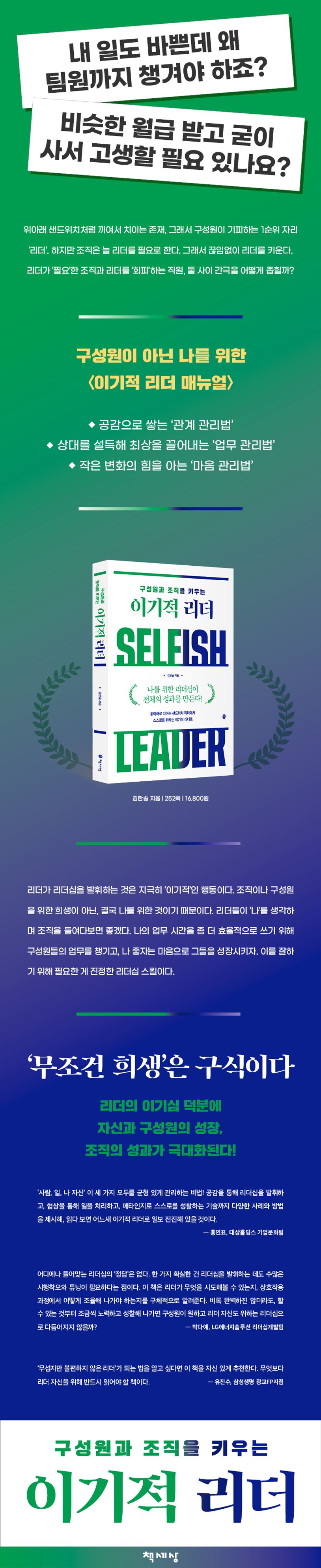 《이기적 리더》는 다른 리더십 교재와 달리, “팀장은 팀원과 조직을 위해 희생해야 한다”는 고정관념을 버리고, “나에게 집중하고 나를 위해 리더십을 발휘하라”고 말한다. 리더가 리더십을 발휘하는 것은 지극히 이기적인 행동이 되어야 한다는 말이다. 팀을 위한, 회사를 위한 리더십이 아닌, 자기 자신에게 가장 도움이 되는 방식으로 리더십을 발휘하면, 결국 그것이 구성원과 조직에도 최선의 영향을 끼친다는 의미다.