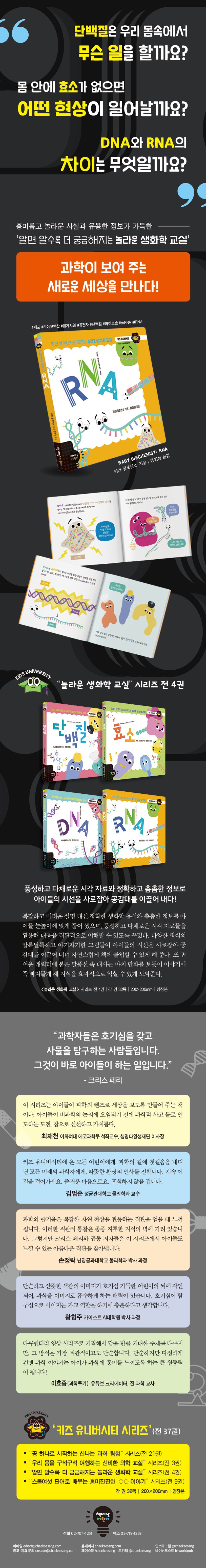 《RNA》는 우리 몸 안의 세포에서 일어나는 모든 일이 순조롭게 이루어지도록 돕는 RNA의 임무와 모양, RNA가 가진 능력과 쓰임새를 어린이 눈높이에 맞춰 간결하지만 정확하게 설명하고, 흥미롭고 놀라운 내용을 짜임새 있는 인포그래픽 형식으로 보여 주는 그림책이다.