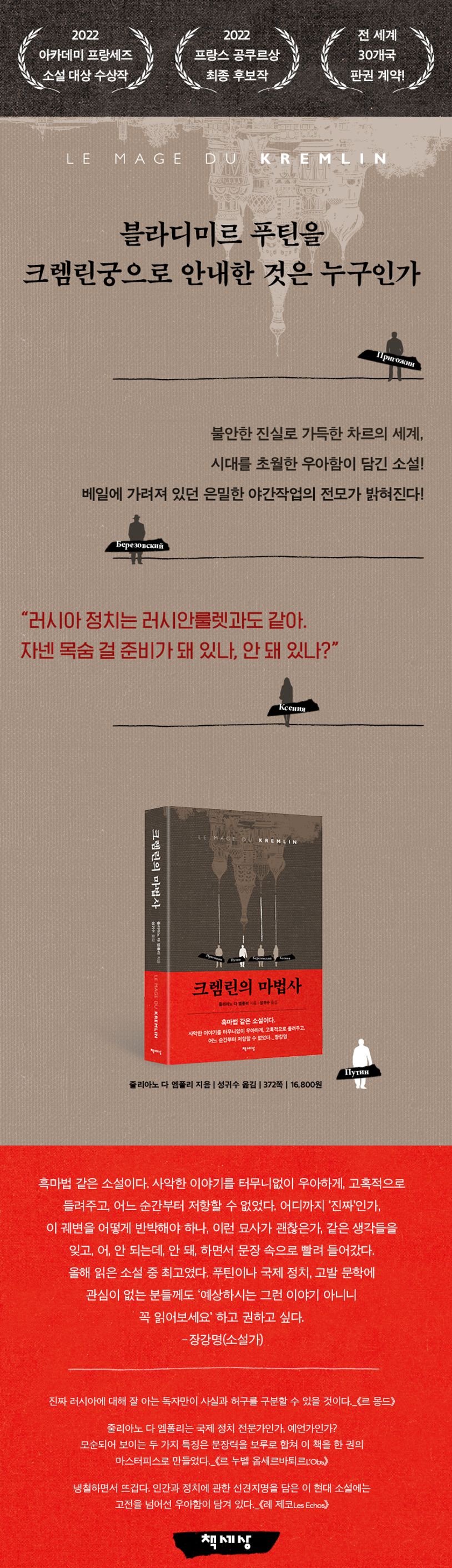 《크렘린의 마법사》는 ‘2022년 프랑스에서 가장 뛰어난 작품’이라는 평을 받으며 아카데미 프랑세즈 소설 대상을 수상한 작품이다. 러시아 정계에 막강한 영향력을 끼치며 ‘크렘린의 마법사’라고 불린 푸틴의 정치 고문 ‘바딤 바라노프’의 고백을 담은 이야기다. 바딤이 밝히는 크렘린궁의 야간작업 이야기는 우리가 잘 몰랐던 러시아 권력의 메커니즘을 적나라하게 보여준다.
