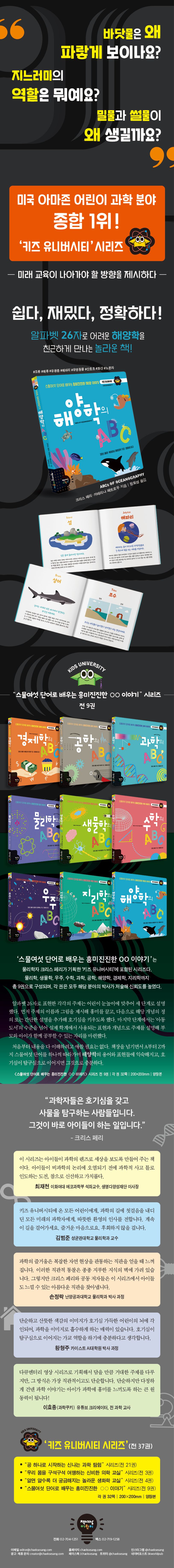 ‘스물여섯 단어로 배우는 흥미진진한 OO 이야기’는 물리학자 크리스 페리가 기획한 ‘키즈 유니버시티’에 포함된 시리즈다. 물리학, 생물학, 우주, 수학, 과학, 공학, 해양학, 경제학, 지리학까지 총 9권으로 구성되며, 각 권은 모두 해당 분야의 박사가 저술해 신뢰도를 높였다.