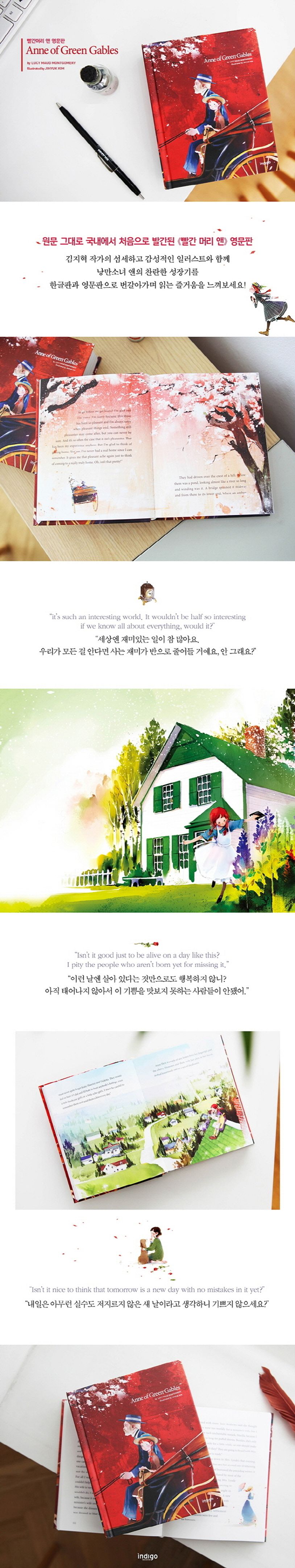 출판사서평영어원문그대로국내에서처음으로발간되는《빨간머리앤》영문판김지혁작가의섬세하고감성적인일러스트와함께낭만소녀앤의이야기를한글판과영문판으로번갈아가며새롭게만나는재미!1908년발표된이후100년이넘는시간동안독자들의사랑을받으며항상곁에두고읽고싶은책으로손꼽히는명작중의명작『빨간머리앤』영문판이출간되었다.원작의감동에섬세한일러스트를더해새로운재미와생명력을불어넣고있는인디고아름다운고전영문판시리즈의네번째책이다.해외원서가아닌국내에서...영어원문그대로국내에서처음으로발간되는《빨간머리앤》영문판김지혁작가의섬세하고감성적인일러스트와함께낭만소녀앤의이야기를한글판과영문판으로번갈아가며새롭게만나는재미!1908년발표된이후100년이넘는시간동안독자들의사랑을받으며항상곁에두고읽고싶은책으로손꼽히는명작중의명작『빨간머리앤』영문판이출간되었다.원작의감동에섬세한일러스트를더해새로운재미와생명력을불어넣고있는인디고아름다운고전영문판시리즈의네번째책이다.해외원서가아닌국내에서는최초로출간되는전문이실린영문판으로,한문장한문장꼼꼼히원서와비교해충실히담아냈다.『키다리아저씨』『작은아씨들』등에서소녀들의감성을서정적으로담아내독자에게사랑받고있는김지혁작가는이책에서빨간머리,주근깨,깡마른몸등앤이지닌독특한특징들은고스란히살리면서도한층더사랑스럽고순수한모습으로우리곁에앤을다시데려다놓았다.그동안원문을읽고싶어도투박하고밋밋한해외원서로는엄두를내지못했거나일부만발췌수록되어있어아쉬움을느끼던독자들은아름다운일러스트가더해진이책을통해앤의사랑스러운조잘거림을그감성그대로원문으로읽는즐거움을경험할수있다.한글판으로뜻을이해하고영문판으로삶과자연에끊임없이찬사를보내는앤의한마디한마디를소리내어따라읽다보면독자들은자연스럽게앤의순수함과열정에물들게될것이다.[출판사서평]인디고아름다운고전시리즈네번째영문판『빨간머리앤』누구보다삶을사랑할줄아는낭만소녀앤의이야기를원어로만난다!시간이흘러도그빛을잃지않는고전명작에섬세하고아름다운일러스트를더해새로운재미와감동을선사하는인디고아름다운고전시리즈.이시리즈는국내독자뿐만아니라대만,홍콩을비롯해오스트리아,영국등세계곳곳의출판사에서많은관심을보이며영문으로읽고싶다는요청에따라영문판을출간하고있다.『빨간머리앤』은『어린왕자』『이상한나라의앨리스』『키다리아저씨』에이은네번째영문판이다.가만히듣고있으면절로미소짓게되는엉뚱하고유쾌한소녀앤의조잘거림을이제영어원문으로만나볼수있게되었다.『키다리아저씨』,『작은아씨들』등에서소녀들의감성을서정적으로그림에담아낸김지혁작가는이책에서빨간머리,주근깨,깡마른몸등앤이지닌독특한특징은고스란히살리면서도한층더사랑스럽고순수한모습으로우리곁에앤을다시데려다놓았다.풍부한상상력과따뜻한마음씨로세상을아름답게물들이는앤의성장스토리농장일을도와줄남자아이를원했지만,말이잘못전달되어빼빼마르고시도때도없이상상속으로빠져드는빨간머리소녀를입양하게된마릴라와매슈커스버트남매.그덕에조용하던초록지붕집이한시도조용할날이없다.상상속이야기를펼쳐놓을때면누구도말리지못할수다쟁이가되는앤은자신의빨간머리가싫어염색을하려다온통머리를초록색으로물들이기도하고,베이킹파우더대신진통제를잔뜩넣은케이크를만들어모두를깜짝놀라게하는등갖가지실수를저지른다.하지만늘밝고긍정적으로최선을다해자신의삶을살아가는순수한앤이기에그런실수까지도눈물나게사랑스럽다.앤에게는다른사람들의마음까지밝고따뜻하게물들이는마법같은힘이있다.100년이지나도마음을설레게하는명작중의명작앤의‘마음의친구’가되어에이번리마을을거닐어보자!『빨간머리앤』은1908년발표이후100년이넘는시간동안독자들을울고웃겨왔다.어떤상황에서도삶의따뜻하고아름다운면을찾아낼줄아는앤의한마디한마디는어린소년소녀에게뿐만아니라성인이된독자에게도희망과위로의메시지가되어준다.영문판에서는앤이삶과자연에보내는찬사들을그대로의감성으로느껴볼수있다.“It’ssoromantic!”“Wasn’titbeautiful?”은앤이입버릇처럼달고다니는말인데,‘romantic’과‘beautiful’이야말로앤의삶을대하는태도를가장잘설명해주는단어가아닐까?영문판에서는우리말번역으로는완벽히전달되기어려웠던앤의감수성이고스란히드러난다.포근하고서정적인색채와묘사로초록지붕집이있는에이번리마을을그대로옮겨놓은김지혁작가의일러스트와함께이책을소리내어읽다보면독자들은마치앤의‘마음의친구’가되어함께‘기쁨의하얀길’이나‘반짝이는호숫가’를거닐며유쾌한수다를나누고있는듯한착각에빠져들게될것이다.