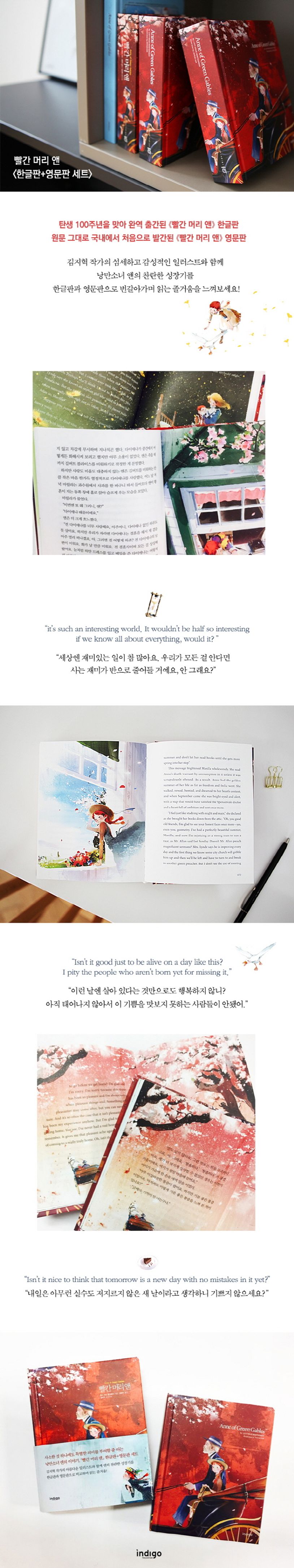 출판사서평김지혁작가의섬세하고감성적인일러스트와함께낭만소녀앤의이야기를한글판과영문판으로번갈아가며새롭게만나는재미!인디고아름다운고전시리즈,『빨간머리앤』누구보다삶을사랑할줄아는낭만소녀앤의이야기를한글판과영문판으로번갈아읽는즐거움!시간이흘러도그빛을잃지않는고전명작에섬세하고아름다운일러스트를더해새로운재미와감동을선사하는인디고아름다운고전시리즈.이시리즈는국내독자뿐만아니라대만,홍콩을비롯해오스트리아,영국등세계곳곳의출판사에서많은관...김지혁작가의섬세하고감성적인일러스트와함께낭만소녀앤의이야기를한글판과영문판으로번갈아가며새롭게만나는재미!인디고아름다운고전시리즈,『빨간머리앤』누구보다삶을사랑할줄아는낭만소녀앤의이야기를한글판과영문판으로번갈아읽는즐거움!시간이흘러도그빛을잃지않는고전명작에섬세하고아름다운일러스트를더해새로운재미와감동을선사하는인디고아름다운고전시리즈.이시리즈는국내독자뿐만아니라대만,홍콩을비롯해오스트리아,영국등세계곳곳의출판사에서많은관심을보이며영문으로읽고싶다는요청에따라영문판을출간하고있다.『빨간머리앤』은『어린왕자』『이상한나라의앨리스』『키다리아저씨』에이은네번째영문판이다.가만히듣고있으면절로미소짓게되는엉뚱하고유쾌한소녀앤의조잘거림을이제영어원문과충실한국내번역을비교하며읽을수있게되었다.『키다리아저씨』,『작은아씨들』등에서소녀들의감성을서정적으로그림에담아낸김지혁작가는이책에서빨간머리,주근깨,깡마른몸등앤이지닌독특한특징은고스란히살리면서도한층더사랑스럽고순수한모습으로우리곁에앤을다시데려다놓았다.풍부한상상력과따뜻한마음씨로세상을아름답게물들이는앤의성장스토리농장일을도와줄남자아이를원했지만,말이잘못전달되어빼빼마르고시도때도없이상상속으로빠져드는빨간머리소녀를입양하게된마릴라와매슈커스버트남매.그덕에조용하던초록지붕집이한시도조용할날이없다.상상속이야기를펼쳐놓을때면누구도말리지못할수다쟁이가되는앤은자신의빨간머리가싫어염색을하려다온통머리를초록색으로물들이기도하고,베이킹파우더대신진통제를잔뜩넣은케이크를만들어모두를깜짝놀라게하는등갖가지실수를저지른다.하지만늘밝고긍정적으로최선을다해자신의삶을살아가는순수한앤이기에그런실수까지도눈물나게사랑스럽다.앤에게는다른사람들의마음까지밝고따뜻하게물들이는마법같은힘이있다.100년이지나도마음을설레게하는명작중의명작앤의‘마음의친구’가되어에이번리마을을거닐어보자!『빨간머리앤』은1908년발표이후100년이넘는시간동안독자들을울고웃겨왔다.어떤상황에서도삶의따뜻하고아름다운면을찾아낼줄아는앤의한마디한마디는어린소년소녀에게뿐만아니라성인이된독자에게도희망과위로의메시지가되어준다.영문판에서는앤이삶과자연에보내는찬사들을그대로의감성으로느껴볼수있다.“It’ssoromantic!”“wasn’titbeautiful?”은앤이입버릇처럼달고다니는말인데,‘romantic’과‘beautiful’이야말로삶을대하는앤의태도를가장잘설명해주는단어가아닐까?영문판에서는우리말번역으로는완벽히전달되기어려웠던앤의감수성이고스란히드러난다.독자들은포근하고서정적인색채와묘사로초록지붕집이있는에이번리마을을그대로옮겨놓은듯한김지혁작가의일러스트와함께이책을소리내어읽다보면마치앤의‘마음의친구’가되어함께‘기쁨의하얀길’이나‘반짝이는호숫가’를거닐며유쾌한수다를나누고있는듯한착각에빠져들게될것이다.