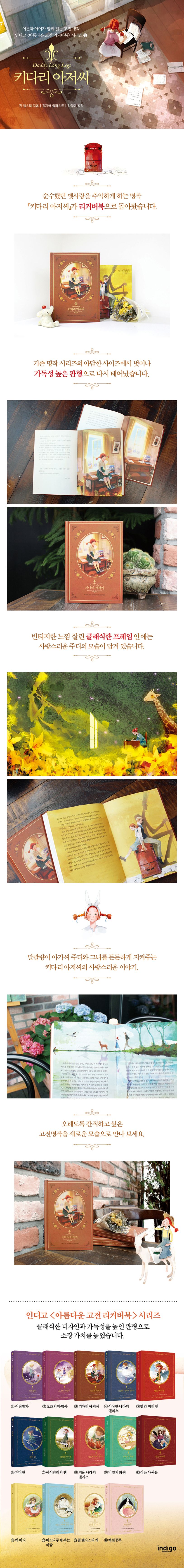 리커버 에디션에서 가장 눈길을 끄는 것은 이전에 출간된 책과 분위기가 달라진 사랑스러운 표지다. 고전의 매력을 살린 클래식한 프레임 안에는 첫사랑에 빠진 소녀 주디의 모습이 담겨 있다. 여기에 그간 익숙했던 인디고 고전 명작 시리즈의 아담한 느낌에서 벗어나 좀 더 커진 가독성 높은 판형을 시도했다.