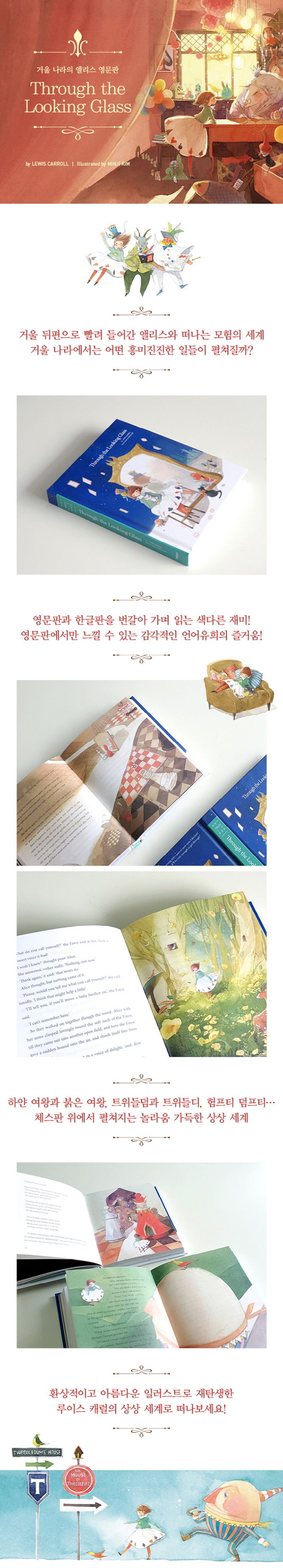 《어린 왕자》 《피터 팬》 등에서 아름다운 색감과 꿈꾸는 듯한 감각적인 일러스트를 선보였던 김민지 작가의 그림이 《거울 나라의 앨리스》를 만나 더욱 환상적 환상적인 이야기 속으로 독자들을 끌어들인다. 거울 속으로 빨려 들어간 앨리스를 따라 체스판 위 말이 된 하얀 왕과 하얀 여왕, 붉은 왕과 붉은 여왕, 트위들덤과 트위들디, 험프티 덤프티, 사자와 유니콘, 하얀 기사 등을 차례로 만나며 펼쳐지는 이야기를 담은 이 소설 속에는 루이스 캐럴의 말장난과 독특한 유희가 가득 차 있어 영문판과 한글판을 비교하며 읽을 때 더 큰 재미를 느낄 수 있다. 흥미진진한 모험과 상상조차 할 수 없는 기발한 이야기를 그대로 되살려낸 일러스트가 독자의 시선을 사로잡는다.