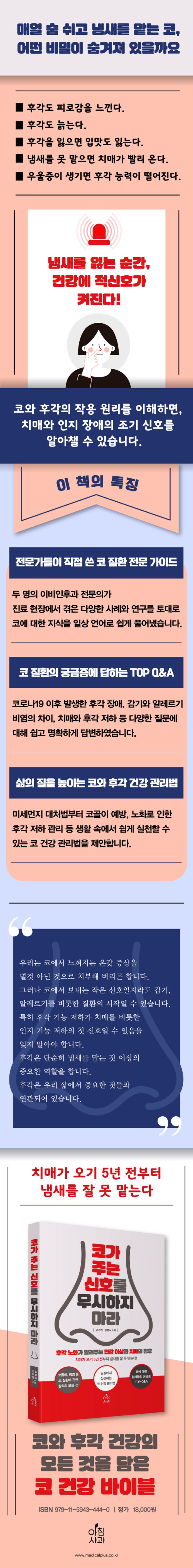 41년 경력의 국내 최고 이비인후과 전문의들이 코와 후각에 관한 모든 것을 전하는 이 책은 후각의 원리, 코의 기능, 다양한 코 질환의 원인과 치료법을 다룹니다. 냄새와 기억, 맛과 후각, 치매와 후각의 관계 등 흥미로운 주제와 함께 자폐스펙트럼 장애와 후각 훈련, 노화하는 코 건강 관리법, 감기, 알레르기 비염, 코골이, 부비동염 등 흔한 코 질환의 예방과 대처법, 생활 속 코 건강 관리 수칙 등 실용적인 정보를 제공합니다. 특히 후각 노화와 치매와의 연관성은 코 건강의 중요성을 새롭게 인식하는 계기가 될 것입니다.