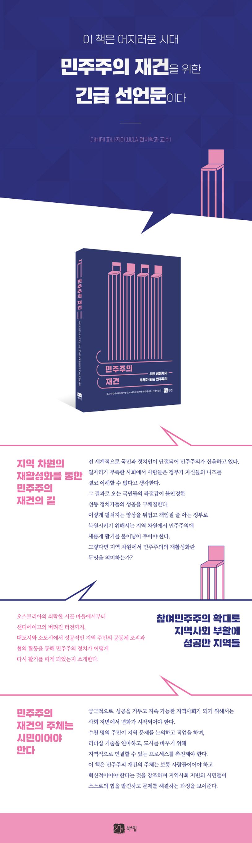 오늘날 전 세계적으로 민주주의가 심하게 신음하고 있 다. 일자리, 인종 차별, 난민 문제 등으로 갈등이 점점 커지고 있다. 특히 일자리 문제는 한 개인의 문제를 넘어 국가적 문제가 되고 있다. 이런 상황에서 지방 소도시의 붕괴는 어느 특정 국가만의 문제가 아니다. 그것을 정부만의 노력으로 해결할 수 있을까? 이 책의 저자들은 성공적인 공동체 조직과 협의 활동 사례들을 활용해 변혁 중에 있는 민주주의 정치가 어떻게 시민운동에 관여함으로써 다시 활기를 띨 수 있는지 소개한다. 그러면서 지역이 살아나기 위해서는 지역공동체의 활동이 중요하며, 지역 탈바꿈을 조절하고 통제할 권한을 주민에게 부여해 탈바꿈 과정을 주민들이 이끌도록 하는 것이 가장 바람직한 방법이라고 강조한다. 지역 경제의 버팀목 역할을 하던 기업체의 이전이나 흥망으로 지역 경제가 큰 영향을 받는 우리나라 상황에서도 이 책에서 소개하는 사례들을 활용하면 방향성이 보일 것으로 기대된다.