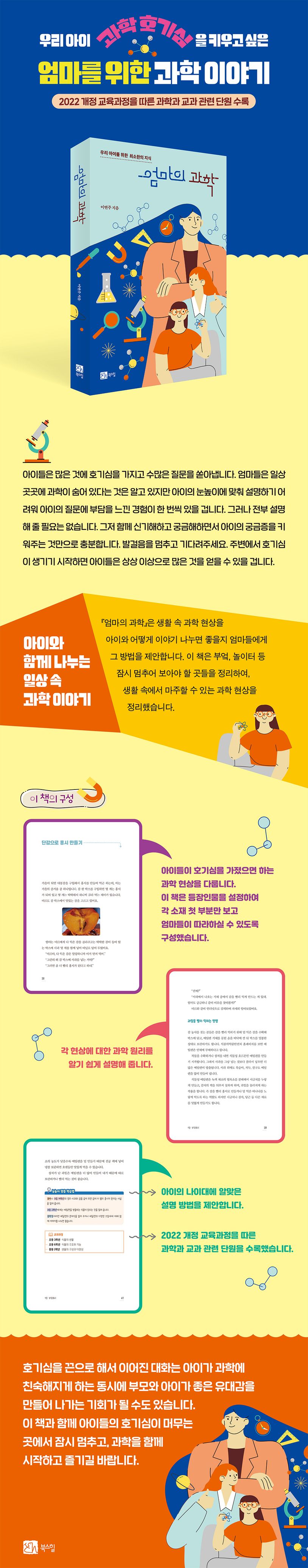 아이와함께나누는일상속과학이야기아이들은엄마와함께놀면서일상곳곳에서호기심을느끼고수많은질문을쏟아냅니다.일상에는과학이숨어있는부분이많고,엄마들도그사실을알고있지만아이의눈높이에맞춰설명하는일은쉽지않습니다.그래서아이의질문이부담스럽게느껴졌던경험이한번쯤은있었을겁니다.『엄마의과학』은아이와일상속과학현상을어떻게이야기나눌수있을지그방법을엄마들에게알려주는책입니다.저자는자신의경험을바탕으로‘부엌에서’,‘놀이터에서’,‘미술관에서’,‘여행에서’,‘일상에서’마주할수있는과학이야기를다섯가지주제로나누어소개합니다.이론물리학자이자두아이의엄마였던저자는아이의질문에“정말신기하네.왜그럴까?”라며함께궁금해하는태도로반응했다고말합니다.아이에게맞춰설명하는일이어렵기도했고,무엇보다부담없이아이와시간을보내기위해서였다고합니다.그렇게함께일상속에서과학을찾아보며답을알려주기보다는호기심을키워준것이아이들에게는큰도움이되었습니다.학교수업만으로도과학을잘하고좋아하게되었고,엄마와나눈많은대화는대학입시면접에서도중요한역할을했다고이야기합니다.이처럼호기심에서시작된대화는아이가과학과친해지게해줄뿐아니라,부모와아이사이에따뜻한유대감을만들어가는좋은기회가될수있습니다.책의구성과사용법『엄마의과학』은각소재마다네가지단계로구성되어있습니다.첫번째는아이가호기심을가질만한과학현상을소개하고,두번째는그현상에담긴과학원리를알기쉽게설명합니다.세번째는아이의나이에따라눈높이에맞춰설명하는방법을정리했고,마지막네번째는2022개정교육과정에서해당주제와연결되는과학교과단원을함께수록했습니다.2022개정교육과정의과학과는문제인식-탐구설계-자료비교·분석-결론도출의순서로학습이이루어지도록되어있습니다.특히모든단원에서강조하는것은자연과일상생활속에서과학과관련된문제를발견하는것이며,바로그시작이‘일상에서과학을찾는일’입니다.이책은9살미르와,과학을전공하지는않았지만미르와다양한이야기를나누고싶어하는40살엄마를주요등장인물로삼았습니다.과학을전공하지않은엄마라도첫부분만읽고바로따라해볼수있도록구성했습니다.아이와함께과학현상에대해궁금해하고,아이의호기심을키워주는것만으로도충분합니다.하지만아이의눈높이에맞춰이유를설명해주고싶거나,스스로의지적호기심을채우고싶은엄마들을위해과학원리도쉽게풀어썼습니다.일상속모든것에서과학을발견하고,아이와이야기를나눠보세요.이책이아이의호기심이머무는곳에서잠시멈추어함께과학을시작하고즐길수있는길잡이가되어줄것입니다.