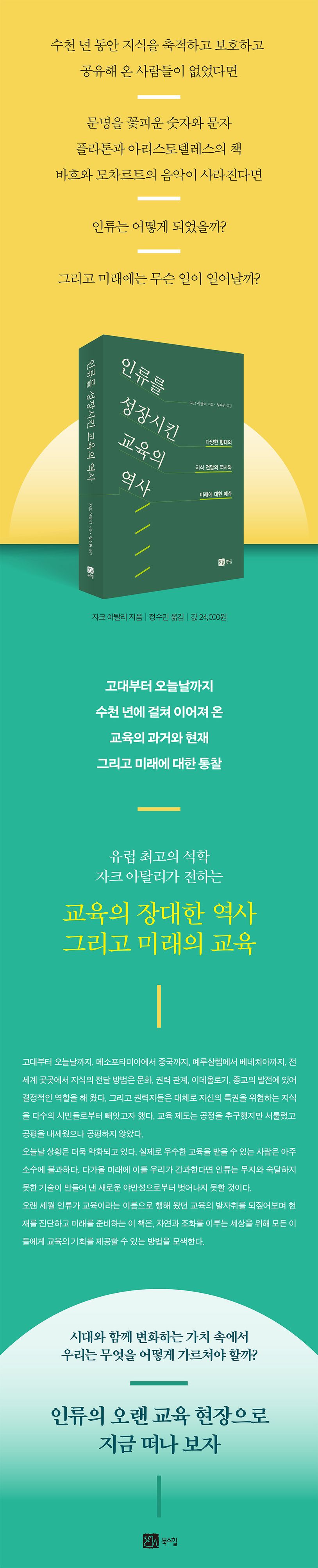 다수의 책에서 다채로운 주제의 역사와 미래를 다뤄 온 자크 아탈리가 이번에는 세계 교육의 방대한 역사를 한 권의 책에 담아냈다. 이 책은 다양한 형태의 지식 전달의 역사와 미래의 교육에 대한 이야기이다. 이 책은 고대부터 오늘날까지, 세계 곳곳에서 행해져 온 교육의 장대한 역사를 차분히 되짚어보고, 전 세계 여러 나라의 교육 현실을 망라하고 있다. 자크 아탈리는 이 책에서 단순히 교육의 역사를 살펴보는 데 그치지 않고, 앞으로 다가올 교육의 미래에 대해서 통찰한다. 이 책과 함께 수천 년 동안 이어져 온 교육의 현장으로 지금 떠나 보자.