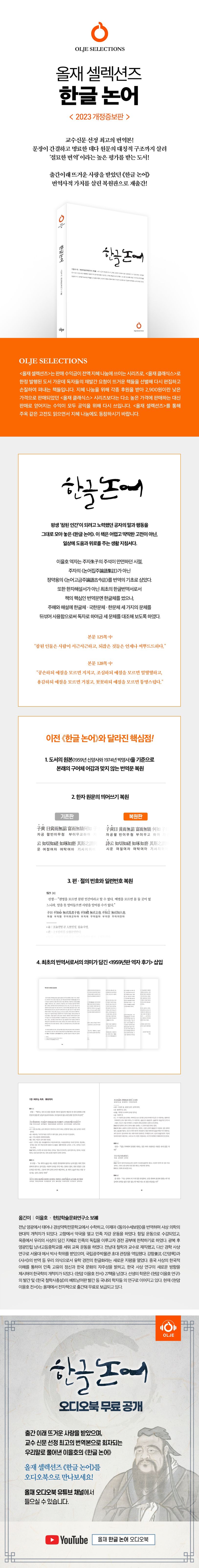 〈올재 셀렉션즈〉 《한글 논어》는 교수 신문 선정 최고의 번역본인 이을호 역으로, 2012년 출간되었던 〈올재 셀렉션즈〉 《한글 논어》 의 개정판이다. 이번 도서는 언해본 형식과 다른 최초의 번역서라는 도서의 번역사적 가치를 살려, 도서의 원본(1959년 신양사와 1974년 박영사)를 기준으로 본래의 구어체 어감과 맞지 않는 번역문과 한자 원문의 띄어쓰기를 복원해 표기했으며, 특히 편·절의 번호와 일련번호 등을 복원해 독자의 독서 편의를 도왔다.