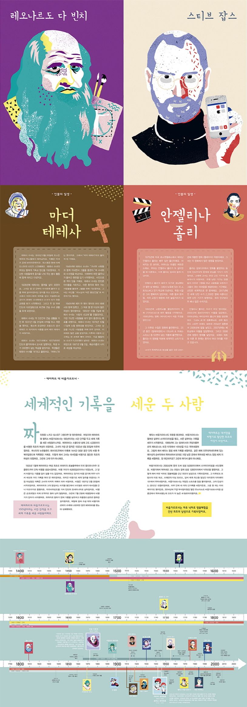 다빈치와잡스,마더테레사와안젤리나졸리…시대를뛰어넘어연결된스무명의인물들항해사이자탐험가인크리스토퍼콜럼버스,그리고우주비행사닐암스트롱.두사람이살았던시대는500년이나차이가나지만한가지공통점을가지고있습니다.바로미지의땅을밟았다는것이지요.콜럼버스는대항해시대에처음으로아메리카대륙을발견해발을디뎠고,암스트롱은우주로날아가인류최초로달에발을내려놓았으니까요.우리에게너무나도유명한인물인레오나르도다빈치와스티브잡스는어떤점이닮았을까요?두사람모두시대를앞서간인물들이었다는것입니다.화가,발명가,엔지니어,과학자,해부학자,조각가,건축가,작가등다양한직업을가졌던다빈치는오늘날수많은발명품에영향을준작품들을남겼습니다.잡스는‘아이폰’이라는어마어마한스마트폰을개발했지요.아무런연관이없을것같은마더테레사수녀와배우안젤리나졸리도연결고리가있습니다.각자의자기방식대로가난한사람들을돕기위해노력한인물들이었지요.테레사수녀는아픈사람들을위한사랑의선교회를만들었고,안젤리나졸리는전세계를누비며난민촌을방문하고인도주의적문제를지원하고자재단을설립했습니다.올랭프드구주와엠마왓슨은여성의권리를위해투쟁한사람들입니다.최초의페미니스트로여겨지는올랭프드구주는남녀평등을비롯해이혼할권리,종교적결혼폐지,혼외자녀인정등여성을위한제도를위해싸웠어요.엠마왓슨은일찍이여자아이들의교육에관심을가졌고,여자아이와남자아이의평등을위한연대캠페인에적극적으로활동하고있어요.이렇듯《다빈치대잡스》는역사의흐름을바꾸기위해힘쓴인물들을개성있고세련된색감의초상화로만나볼수있습니다.시간을초월한그들의특별한공통점과,아울러세계의역사속에서어떠한사건들이있었는지알게해줄것입니다.*인증유형:공급자적합성확인