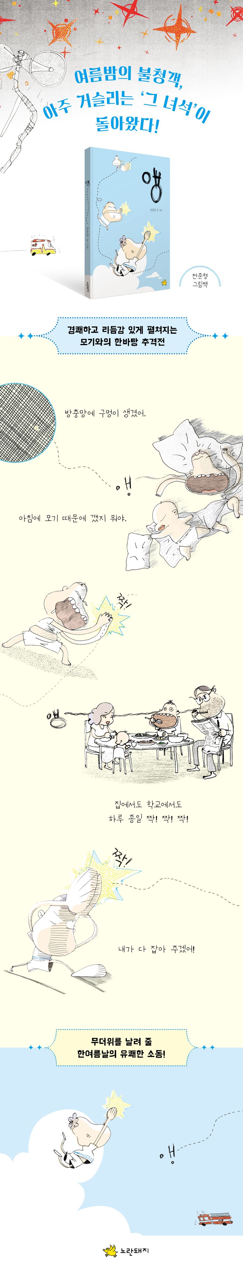 어느 여름날, 아이는 방충망에 생긴 구멍을 보고 테이프로 막을 생각을 하지만 까먹고 만다. 그 구멍으로 들어온 모기를 시작으로 집, 등굣길, 학교, 놀이터 등 가는 곳마다 모기를 만나고, 아이는 그때마다 ‘짝!’ 소리를 내며 잡느라 여념이 없다. 모습이 직접 등장하지 않고, 소리와 궤적으로만 그려지는 모기와의 전쟁 같은 하루를 재미있고 유쾌하게 담아낸 그림책이다.