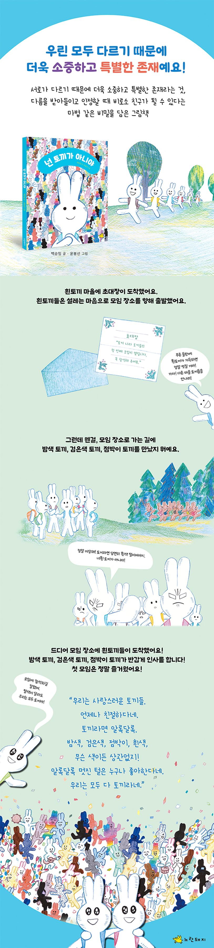겉모습이나 생각이 나와 다르다는 이유로 고정관념에 사로잡혀 상대방을 배척하는 일은 흔히 볼 수 있다. 이 책은 귀엽고 친숙한 토끼 캐릭터를 등장시켜 주변에서 우리가 쉽게 접할 수 있는 차별과 편견에 대해 자연스럽게 생각해 볼 수 있게 한다. 서로가 다르기 때문에 더욱 소중하고 특별한 존재라는 것, 다름을 받아들이고 인정할 때 비로소 친구가 될 수 있다는 마법 같은 비밀을 담은 그림책이다.