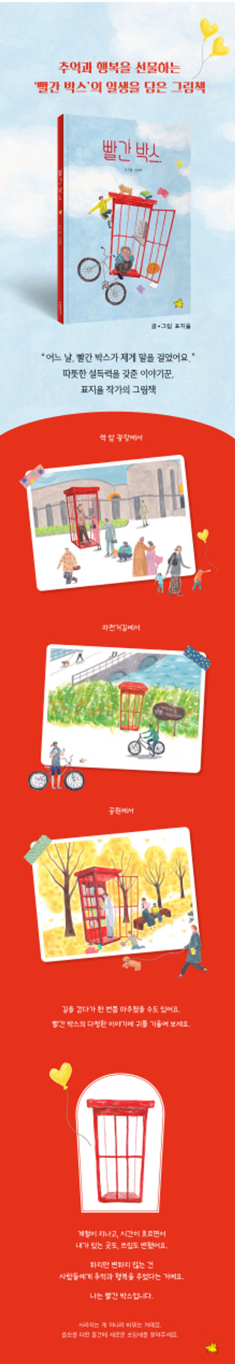 눈높이 아동문학상 수상으로 이야기꾼으로서의 능력을 인정받은 표지율 작가의 그림책 《빨간 박스》가 출간되었다. 이 그림책은 시간의 흐름에 따라 쓰임새가 바뀌어 온 ‘빨간 박스’ 이야기를 담고 있다. 쓰임새가 아무리 바뀌어도 변하지 않는 건 빨간 박스가 사람들에게 추억이 깃든 행복을 주었다는 사실이다. 모든 게 빠르게 업그레이드되고, 대체되는 세상을 바라보며 작가는 새로운 걸 만드는 대신 빨간 박스처럼 새로운 쓰임새를 찾는 게 어떠냐고 이야기한다. 독자들이 쓸모를 다한 물건에 새로운 쓰임새와 의미를 찾아주기를 바란다.
