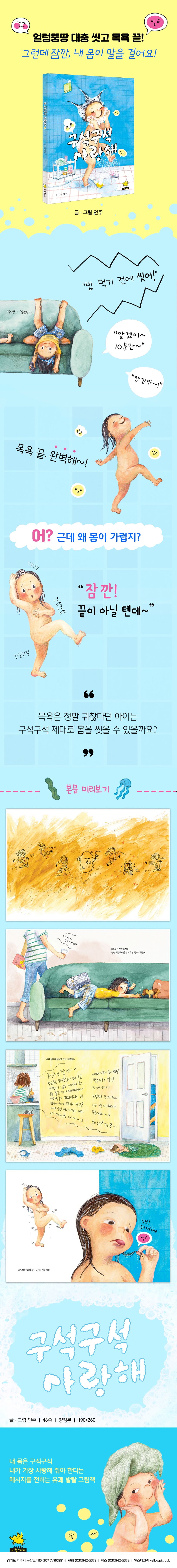 우리 친구는 온몸 구석구석에서 말을 걸어오는 유쾌한 상상으로 언제 목욕하기 귀찮아 소파에 이리저리 뒹굴었는지 까맣게 잊고 신체의 부분 부분들과 대화하고 불평을 바로 해결해 주느라 정신이 없네요. 평소 대충 씻고 말았던 부분들이 그대로 드러나 창피할 수도 있지만, 기분이 나쁘거나 화나지 않습니다. 간질간질, 미끌미끌, 까꿍. 뽀드득뽀드득 소리가 날 때까지 즐겁게 목욕 놀이를 하게 되지요. 작가는 스스로 구석구석 깨끗하게 잘 씻어서 몸을 아끼고 사랑하자고 말합니다. 나도 모르게 리듬을 타며 읽게 되는 의성어와 의태어, 그리고 강조할 부분만 그리는 대담함과 귀여운 그림체로 아이들의 감각을 자극하여 책을 보는 재미도 한층 더했습니다. 아이들 눈높이에 맞추어 발랄하고 유쾌하게 풀어낸 《구석구석 사랑해》는 즐거운 목욕 놀이 그림책입니다.