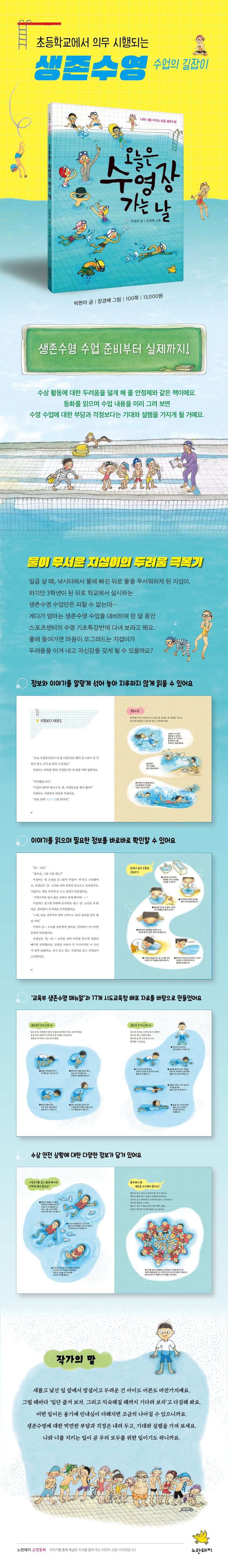 세월호참사 이후 정부 주도로 초등학교에서 '생존수영'을 배우도록 하고 있다. 초등 1학년부터 6학년까지 교육과정에서 수상안전과 관련된 내용을 체계적으로 다룬다. 이 책은 생존수영 수업 전 준비부터 수업 과정까지 간접 체험해 볼 수 있도록 구성한 어린이 교양동화이다. 실제 학교에서 이루어지는 생존수영 수업을 바탕으로 썼기 때문에 수업을 앞둔 어린이들이 수영에 대한 공포심을 줄이고, 나아가서는 물놀이에 대한 즐거움을 깨칠 수 있도록 돕는다. 수영을 못해서, 물이 무서워서, 생존수영 수업이 두려운 아이들에게 이 책을 미리 읽어 볼 것을 권한다. 물에 대한 두려움보다는 설렘을 가지게 해 줄 안정제 같은 역할을 할 것이다.