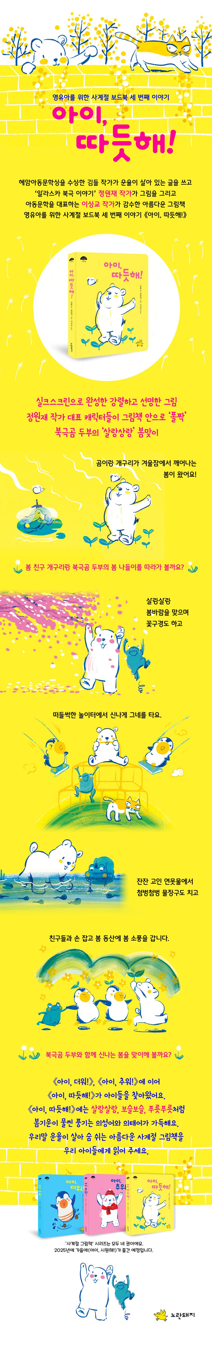 봄, 여름, 가을, 겨울의 날씨와 풍경, 소리와 맛을 모두 느낄 수 있는 영유아 보드북 시리즈 ‘사계절 그림책’의 세 번째 이야기 《아이, 따듯해!》가 출간되었다. 그림책에는 아른아른, 살랑살랑, 보슬보슬, 팔랑팔랑처럼 따뜻함이 담뿍 담긴 의성어와 의태어로 봄을 만끽할 수 있다.