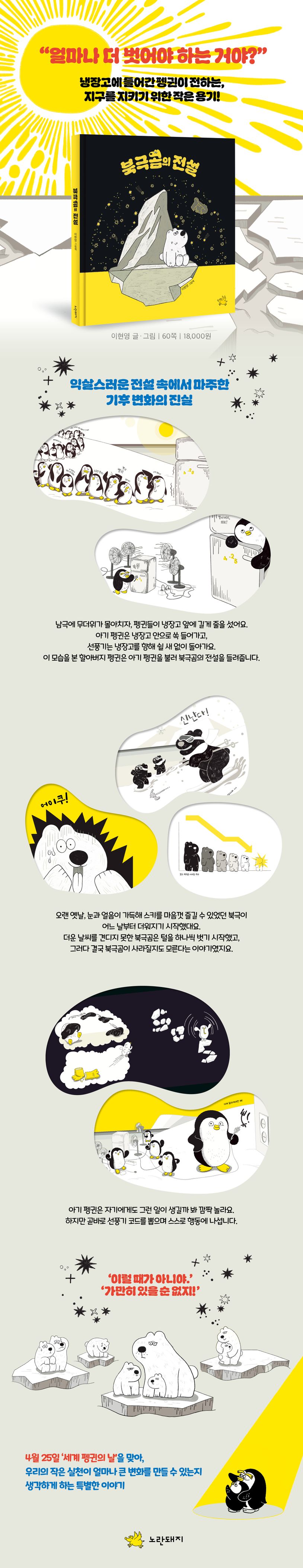 유쾌한 상상 속에 담긴, 지구를 지키는 작은 용기의 이야기. 무더운 남극, 냉장고 안에서 선풍기를 쐬고 있는 아기 펭귄에게 할아버지는 전설 하나를 들려준다. 오래전, 지구 북쪽 끝에는 윤기 나는 검은 털을 휘날리며 얼음 위를 뛰노는 북극곰이 살고 있었다. 하지만 어느 날부터 시작된 더위는 좀처럼 멈추지 않았고, 견디다 못한 북극곰은 털을 벗고 벗다 결국 사라질지도 모른다는 이야기였다. 전설을 들은 펭귄은 언젠가 자기에게도 그런 일이 닥칠까 두려움에 빠지지만, 곧 그 불안을 작은 실천으로 바꾼다. 유쾌한 상상과 사랑스러운 그림 속에 기후 위기의 현실을 담아낸 《북극곰의 전설》은, 4월 25일 ‘세계 펭귄의 날’을 맞아 더욱 특별한 의미로 다가온다. 지구를 지키는 첫걸음은 거창한 일이 아니라, 지금 이 순간 ‘나부터’ 시작할 수 있다는 것을 깨닫게 한다.