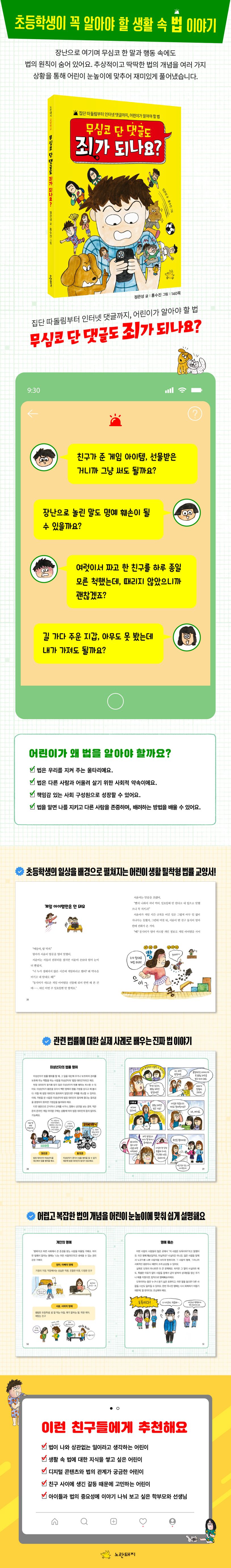 어린이들이 살아가면서 마주칠 수 있는 여러 가지 상황을 통해, 법이 무엇인지, 왜 중요한지, 어떻게 나와 다른 사람을 지켜 주는지, 어떤 행동이 옳은지를 알려 준다. 약자를 배려하고 책임감 있는 사회 구성원으로 살아가기 위해 어린이들이 꼭 알아야 할 법 이야기를 사례를 중심으로 살펴볼 수 있다. 장난으로 여기며 무심코 던진 말과 행동이 법적으로 어떤 의미를 갖는지, ‘모르고’ 한 행동도 ‘책임’은 피할 수 없다는 걸 명확하게 알려 준다. 아이들에게 추상적이고 딱딱한 개념인 법을 여러 가지 상황을 통해 아이들 눈높이에 맞추어 재미있게 풀어낸 어린이 교양서이다.