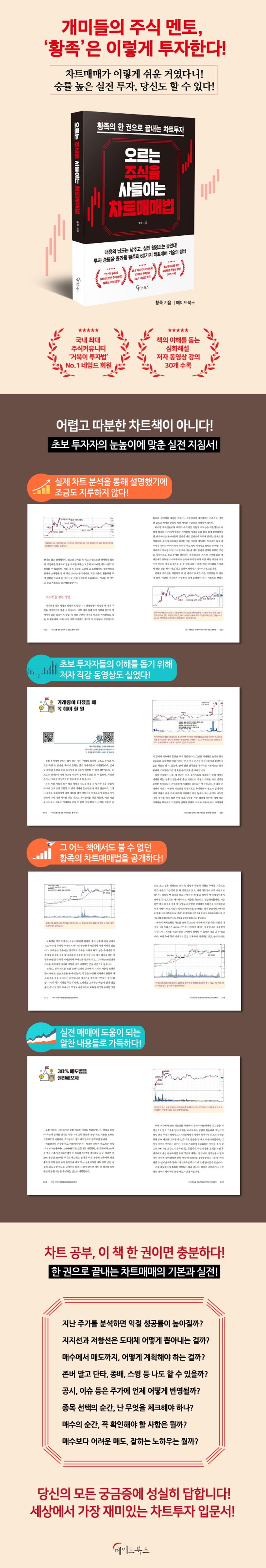 약 7만 명 구독자를 보유한 유튜브 채널 〈세상의 모든 주식 황족〉을 운영하며, 국내 최대 주식커뮤니티 〈거북이 투자법〉에서 진정성 있는 주식정보를 제공해 많은 주식 초보 투자자들에게 사랑받는 황족의 두 번째 저서가 출간되었다. 이 책에서는 그동안 저자의 투자 승률을 높여준 60가지 차트매매 기술을 총정리했다. 수익 가능성을 높이기 위해 반드시 알아야 할 주식투자 기초 지식, 주가 흐름의 분석 기준, 종목과 수급의 고찰, 매수·매도 타이밍 잡는 법, 멘탈 관리법까지 상세히 담아낸 최고의 주식투자서이다. 어렵고 따분한 이론보다는 초보 투자자들의 눈높이에 맞춘 실전 투자서이다. 실제 차트 분석을 통해 설명했기에 조금도 지루하지 않다. 초보 투자자들의 이해를 돕기 위해 저자가 직접 강의하는 동영상도 실었다.
