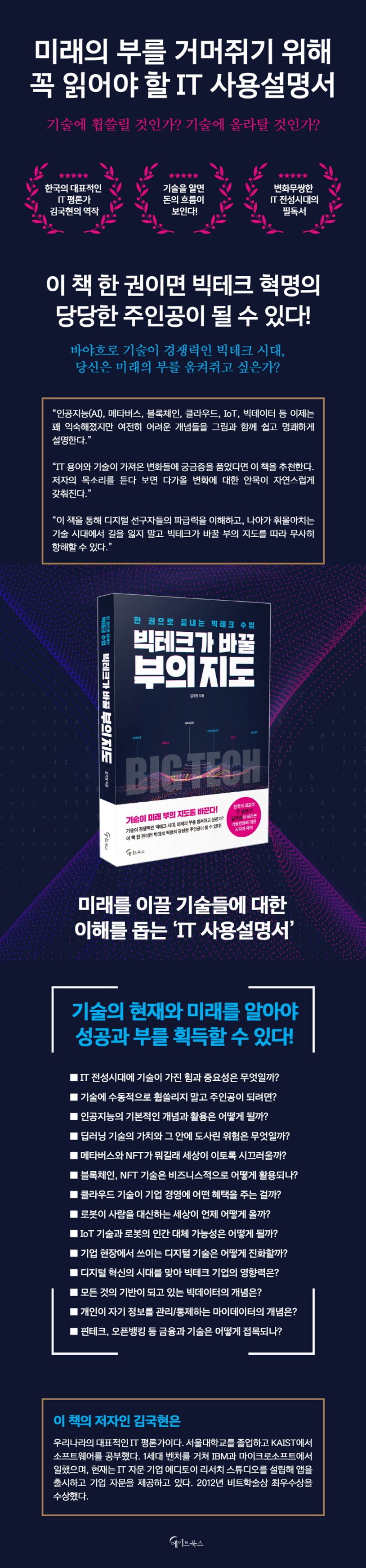 기업 생존에 이제 기술은 필수다. 흔히 세계적인 5대 빅테크 기업이라 일컬어지는 ‘구글, 애플, 아마존, 마이크로소프트, 메타(구 페이스북)’는 대표적인 3세대 디지털 자재 공급업자로서 많은 기업의 기반 기술을 제공한다. 이런 흐름에 따라 디지털을 공부한다는 일 자체가 빅테크 기업이 제공하는 기술을 공부한다는 말과 동의어가 되고 있다. 이들이 주도하는 기술을 알면 돈의 흐름이 보인다. 미래의 부를 획득하기 위해서는 이들이 내놓고 발전시키는 기술에 능동적으로 적응해야만 한다. 혁신을 가져다줄 미래기술을 탐구하는 이 책을 통해 디지털 선구자들의 파급력을 이해하고, 나아가 휘몰아치는 기술 시대에서 길을 잃지 말고 빅테크가 바꿀 부의 지도를 따라 무사히 항해하길 바란다.