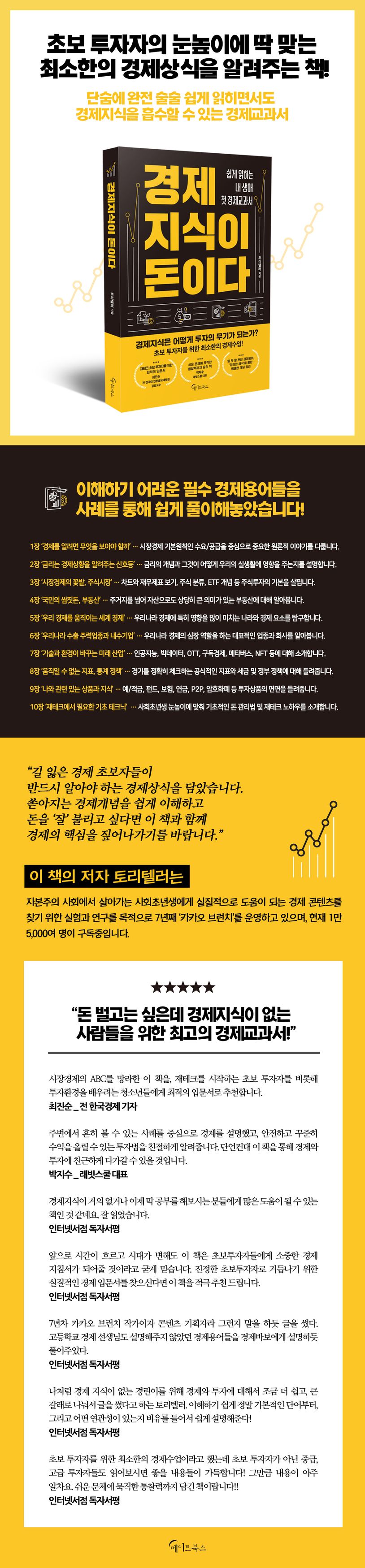 저자인 토리텔러는 자본주의 사회에서 살아가는 사회초년생에게 실질적으로 도움이 되는 경제 콘텐츠를 찾기 위해 늘 연구하는 친절한 경제 선생님이다. 초보 투자자들을 포함한 경제 초보자들이 평소 가장 궁금해할 만한 개념과 용어를 그들의 눈높이에 맞춰 쉽게 설명한다. 주식투자, 부동산, 세금, 미래를 이끌어 갈 기술과 산업, 다양한 투자상품과 재테크를 위한 기초 테크닉 등 경제상식의 A부터 Z까지를 알차게 담았다. 군더더기는 빼고 당장 써먹을 수 있는 필수지식만 엄선했다. 알 듯 말 듯한 경제용어를 ‘정의와 해석’을 통해 명쾌하게 개념 정리하고 있으며, 실생활과 가까운 사례를 통해 이해를 돕는다. 알짜배기만을 담은 이 책 한 권이면 경제 문외한이라도 경제 흐름을 파악하고, 투자를 통한 달콤한 수익도 맛볼 수 있을 것이다.